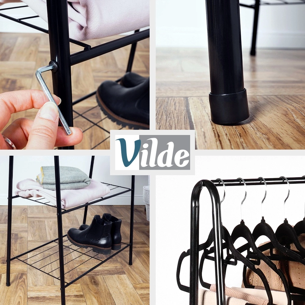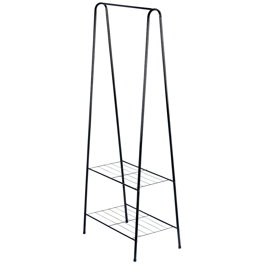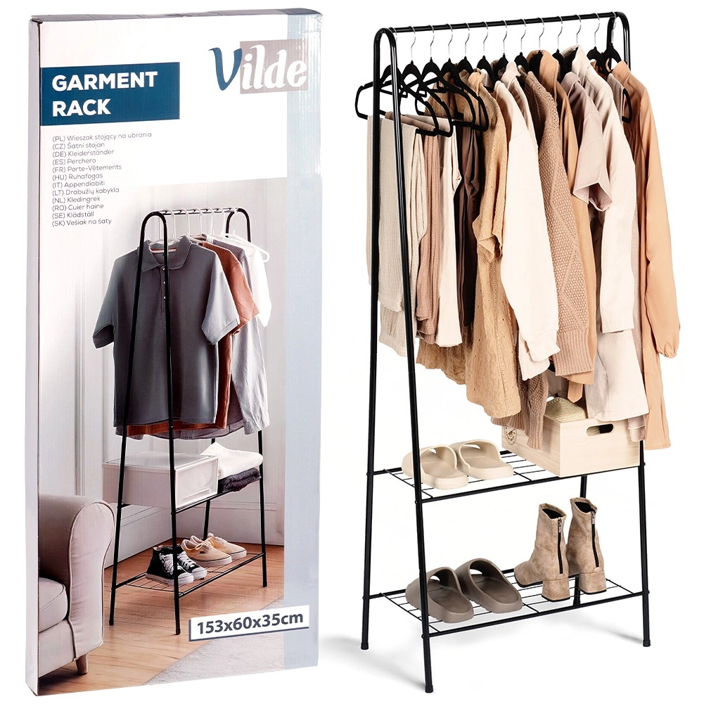 Ten wolnostojący metalowy wieszak o wymiarach 60 × 35 × 153 cm zapewnia niezawodne i eleganckie miejsce do zawieszania koszul, płaszczy czy sukienek, a para dolnych półek utrzyma Twoje buty, pudła lub akcesoria w porządku i pod ręką. Minimalistyczna, otwarta forma z łatwością wpasuje się w nowoczesne wnętrza.