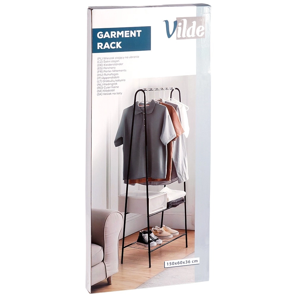 Praktyczny i stylowy stojący wieszak w industrialnym stylu LOFT oferuje oszczędne rozwiązanie do przejrzystego przechowywania ubrań i obuwia. Dzięki solidnej metalowej konstrukcji w czarnym kolorze, dwóm drucianym półkom oraz górnej poprzeczce na wieszaki, jest idealny do przedpokoju, sypialni, garderoby i biura.