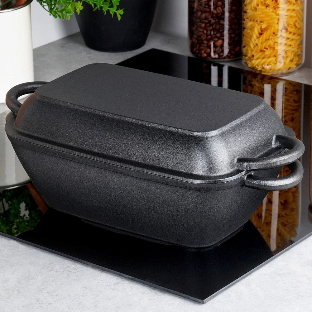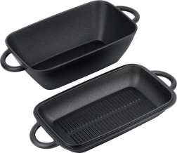 Ta praktyczna żeliwna brytfanna oferuje od razu dwa naczynia: głębokie korpus o pojemności 3,5 l oraz pokrywkę z wewnętrznym żebrowaniem grillowym, którą można używać jako patelnię o pojemności 1,5 l. Dzięki równomiernemu rozprowadzaniu ciepła i znakomitej akumulacji idealnie nadaje się do soczystego pieczenia, powolnego duszenia i chrupiącego grillowania.
