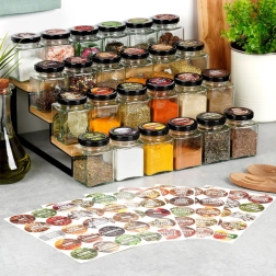Zestaw 24 szklanych słoiczków z etykietami utrzyma przyprawy i zioła w sposób uporządkowany i zawsze pod ręką – od szuflady po kuchenny stojak.