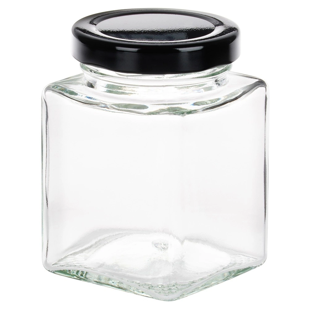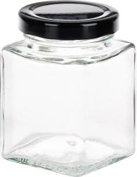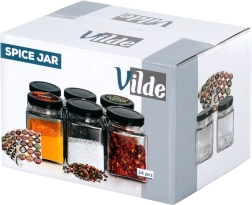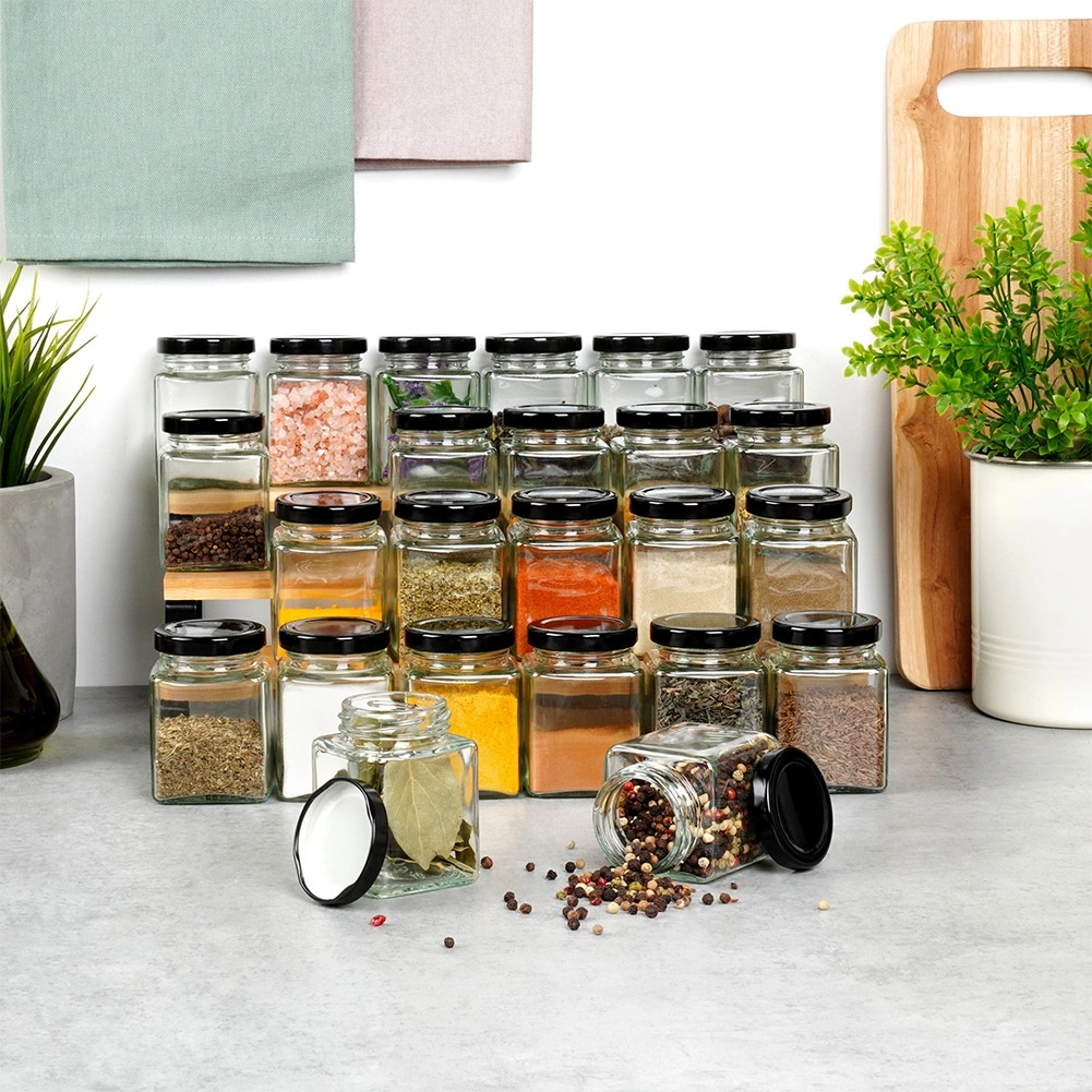Przezroczyste szkło umożliwia natychmiastową kontrolę zawartości, a czarne metalowe zakrętki z gwintem chronią przed wilgocią i zachowują aromat.