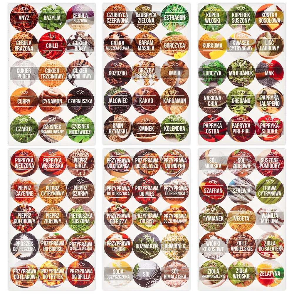 90 samoprzylepnych etykiet z nazwami najpopularniejszych przypraw zapewnia profesjonalny wygląd i szybkie znalezienie właściwego składnika podczas gotowania.