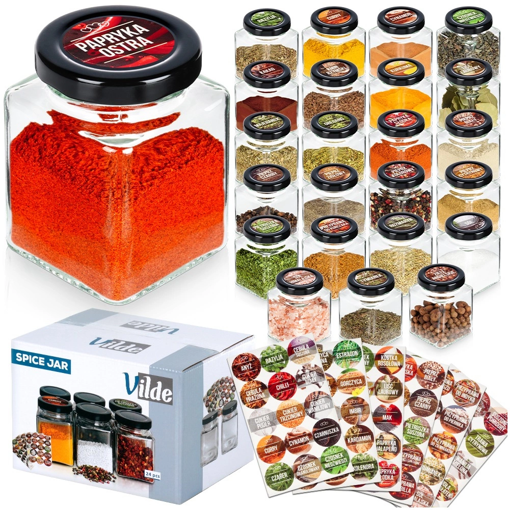 Wprowadź do kuchni porządek i styl. Ten zestaw oferuje 24 eleganckie kwadratowe słoiczki (5,5 × 5,5 × 7,5 cm, 100 ml) z przezroczystego szkła z czarnymi metalowymi zakrętkami, które niezawodnie uszczelniają i chronią zawartość przed wilgocią. Dołączone samoprzylepne etykiety z nazwami najpopularniejszych przypraw i ziół pomogą utrzymać idealny porządek.