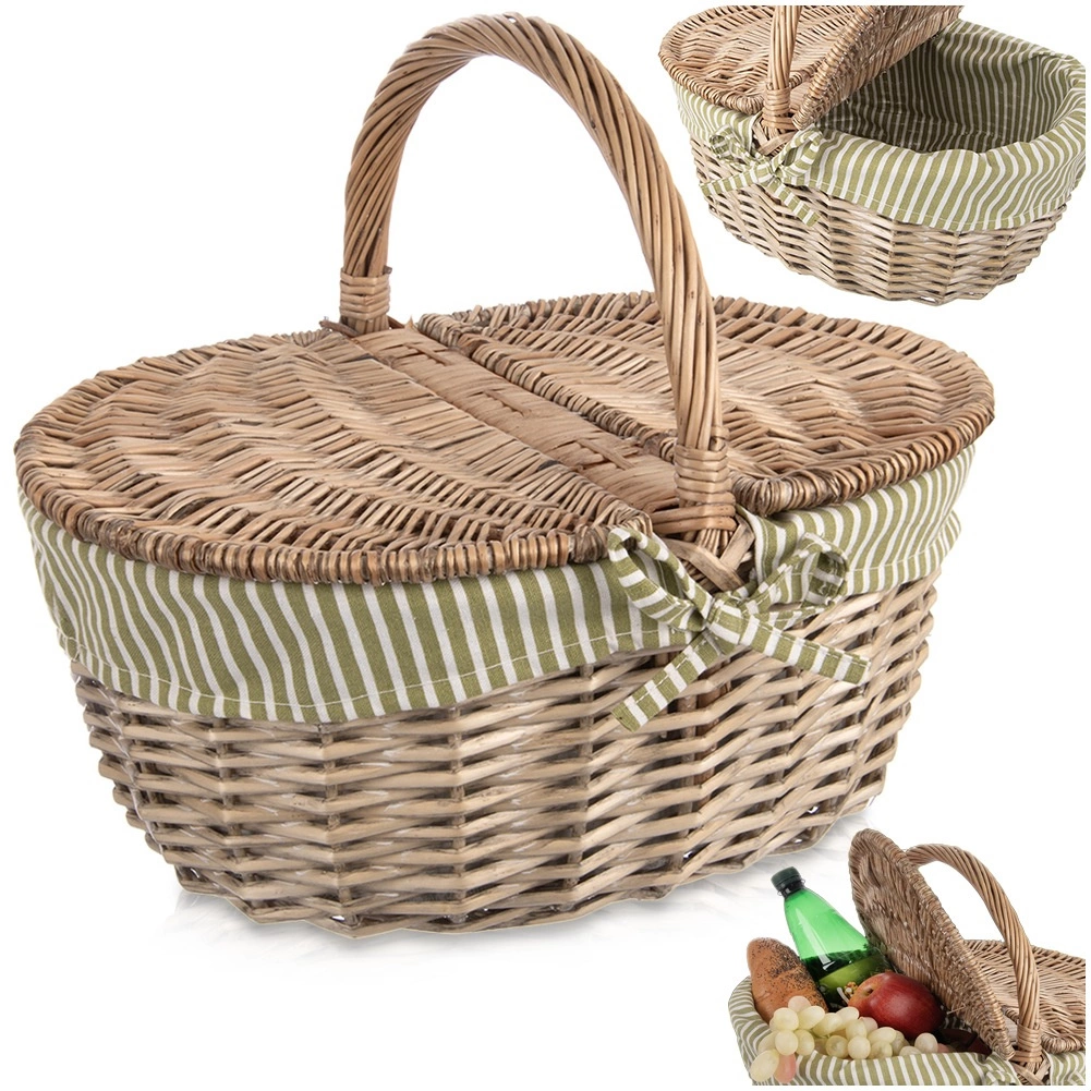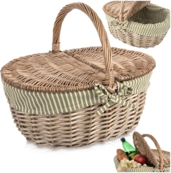 Elegancki wiklinowy kosz piknikowy z dwustronnie otwieraną pokrywą i solidnym uchwytem idealnie sprawdzi się na wycieczki i do parku. Ma wyjmowaną materiałową wkładkę w zielono-białe paski, którą można prać, i oferuje solidne, ręczne wykonanie z naturalnej wierzby, dużo miejsca na przekąski oraz uniwersalne zastosowanie – od pikniku przez zakupy po zbieranie grzybów.