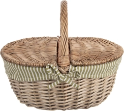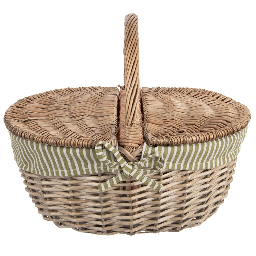 Ten stylowy wiklinowy kosz jest ręcznie pleciony z wysokiej jakości naturalnej wikliny, a dzięki solidnemu łukowatemu uchwytowi wygodnie się go przenosi. Dzielona pokrywa otwiera się z obu stron, więc łatwo sięgniesz po schowane jedzenie i napoje. Materiałowa wyściółka w zielono-białe paski wygląda świeżo i jednocześnie chroni zawartość kosza.