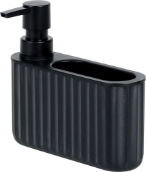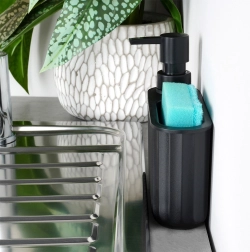 Ten dozownik łączy przechowywanie gąbki i dozowanie płynu w jednym kompaktowym rozwiązaniu. Matowa czarna powierzchnia o żłobkowanej strukturze świetnie komponuje się z nowoczesnymi, klasycznymi i industrialnymi wnętrzami, utrzymując okolice zlewu w czystości i porządku.