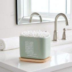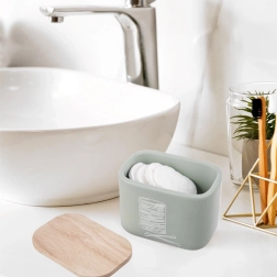 To eleganckie pudełko z serii GREENISH pomoże utrzymać łazienkę przejrzystą i higieniczną. Solidny korpus z wytrzymałego kamienia syntetycznego wiernie naśladuje ceramikę, a naturalna bambusowa pokrywka chroni zawartość przed wilgocią i kurzem. Kompaktowe wymiary pasują na każdą półkę lub umywalkę, a mimo to mieszczą wystarczającą ilość patyczków czy płatków.