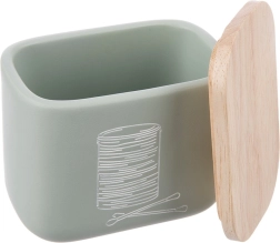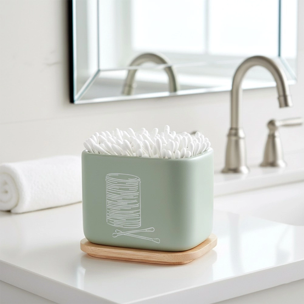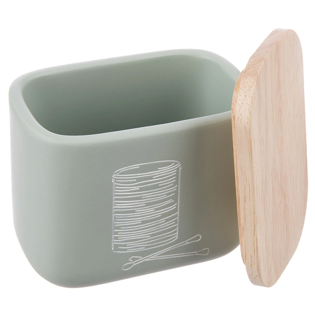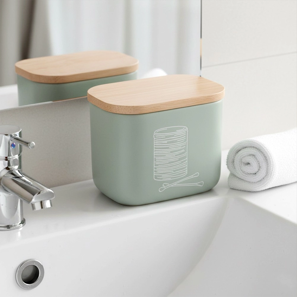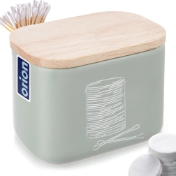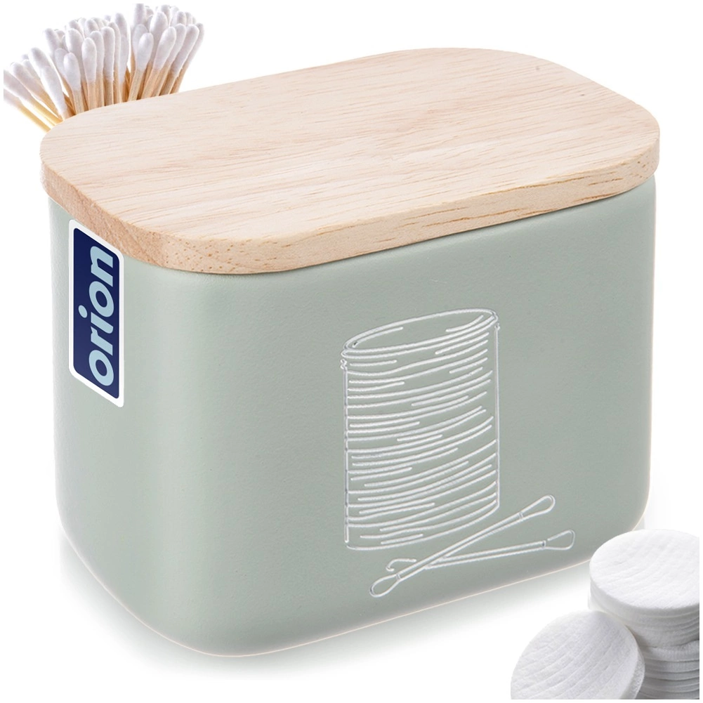 Stylowy i kompaktowy organizer łazienkowy na patyczki kosmetyczne i płatki z bambusową pokrywką. Z wysokiej jakości kamienia syntetycznego o wyglądzie ceramiki, w nowoczesnym miętowozielonym kolorze. Oszczędza miejsce, chroni zawartość przed kurzem i łatwo się uzupełnia. Oryginalny produkt marki ORION.