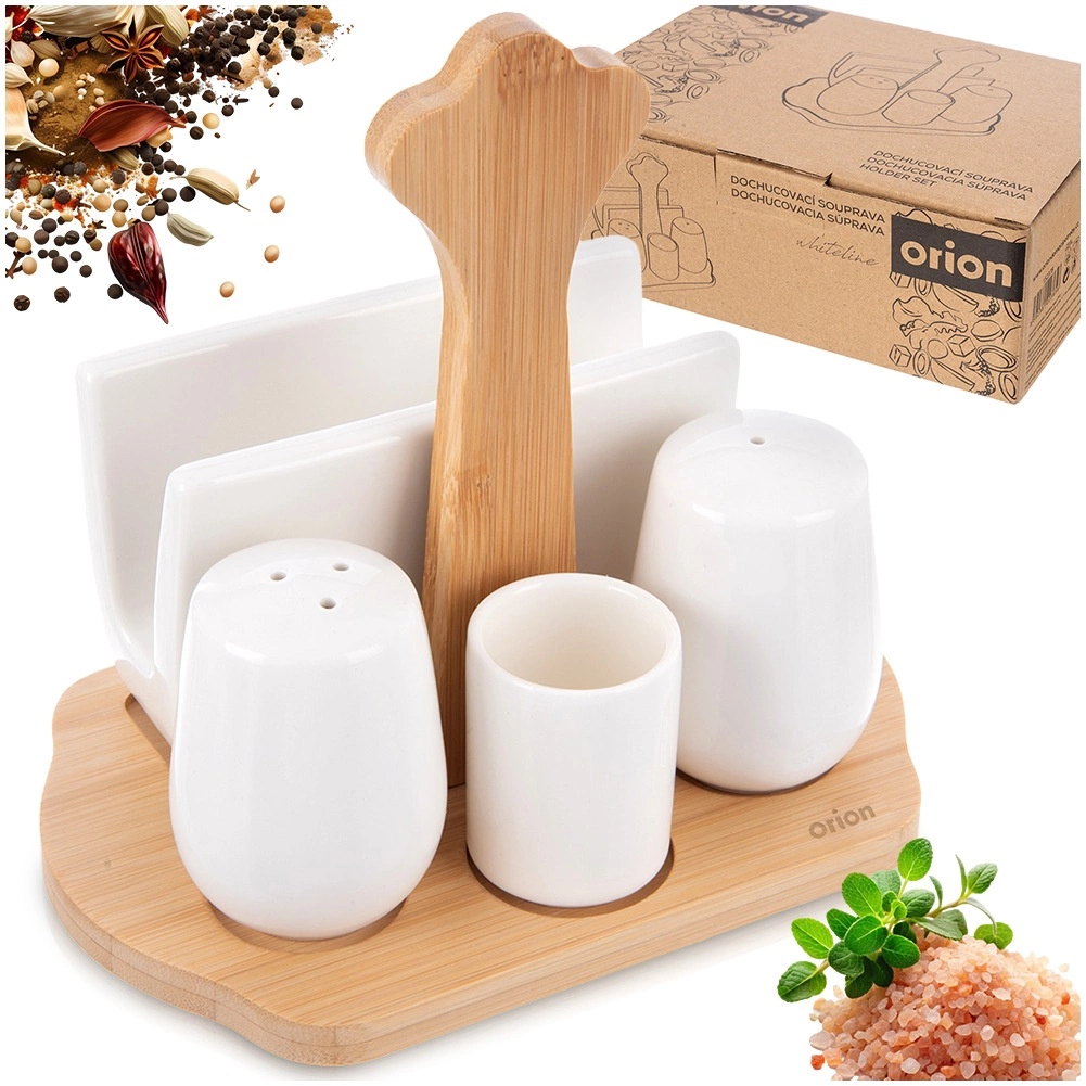 Elegancki 5‑częściowy zestaw WHITELINE łączy w sobie porcelanową solniczkę i pieprzniczkę, uchwyt na serwetki oraz kubeczek na wykałaczki na stylowej bambusowej podstawie z uchwytem. Idealny na co dzień i na uroczyste okazje, łatwy w czyszczeniu i doskonale pasuje do każdej aranżacji stołu.