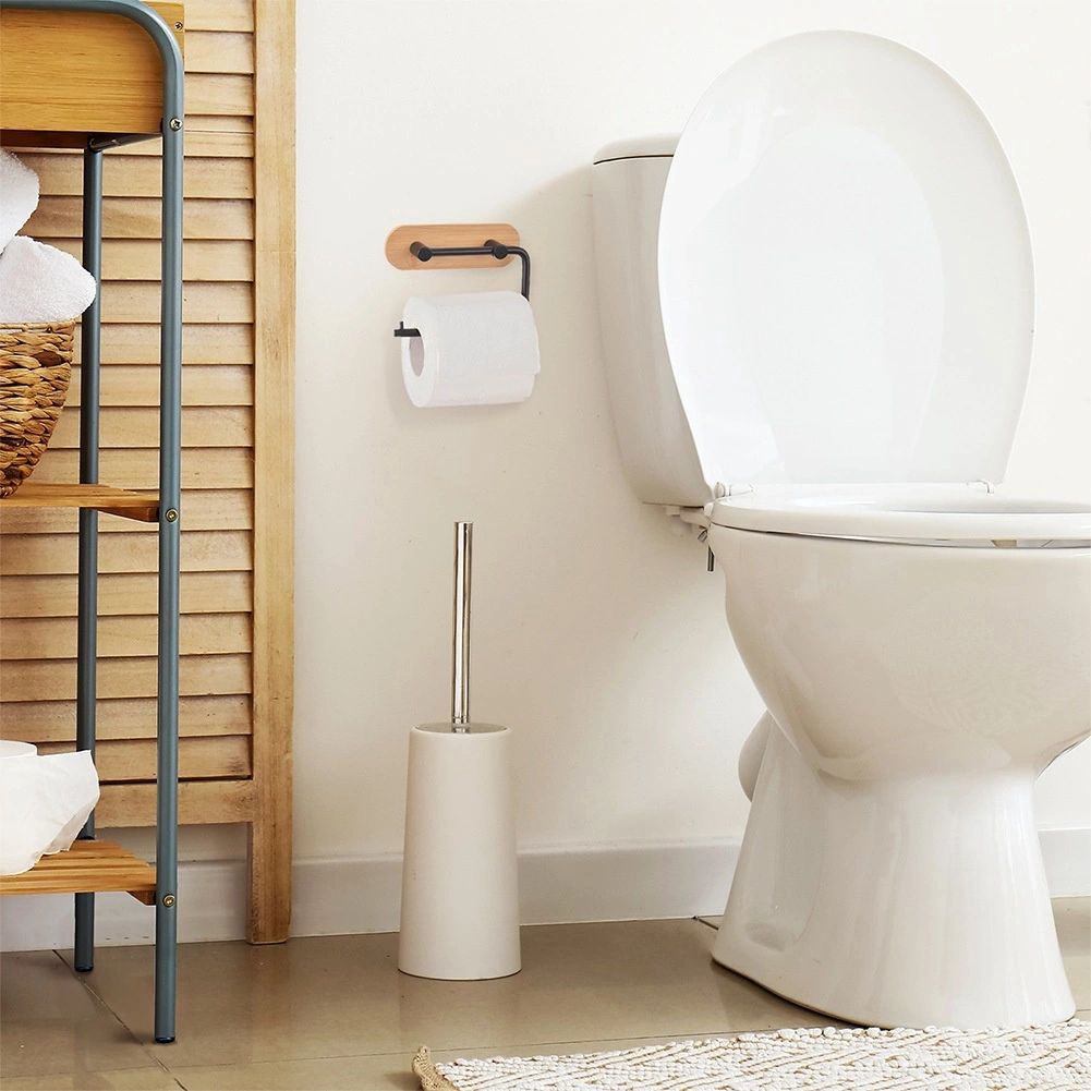 Elegancki uchwyt na papier toaletowy wnosi czysty design i funkcjonalność do każdej łazienki. Metalowe ramię w czarnym kolorze i bambusowa podstawa doskonale pasują do nowoczesnych wnętrz, a jednocześnie zapewniają trwałość i długą żywotność. Dzięki przemyślanemu kształtowi wymiana rolki jest szybka i wygodna.