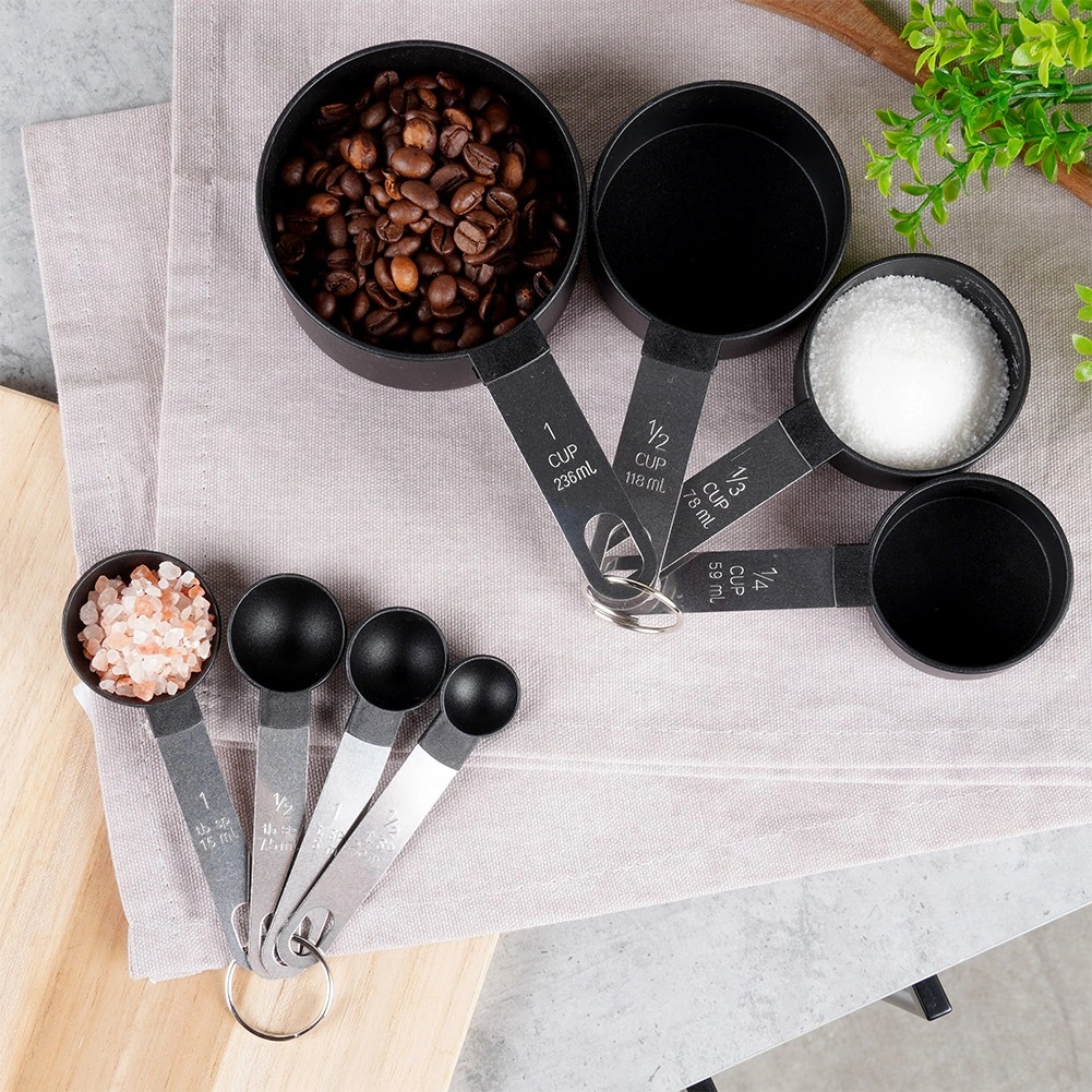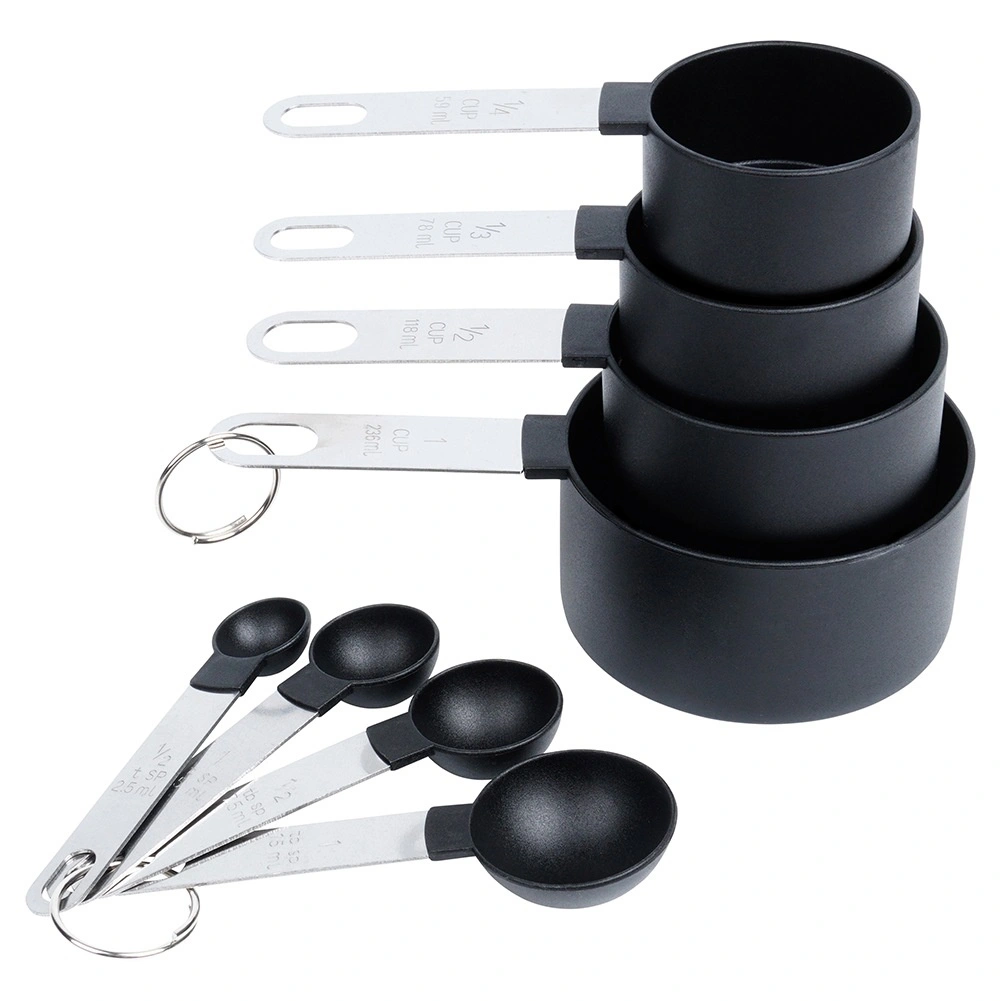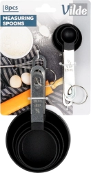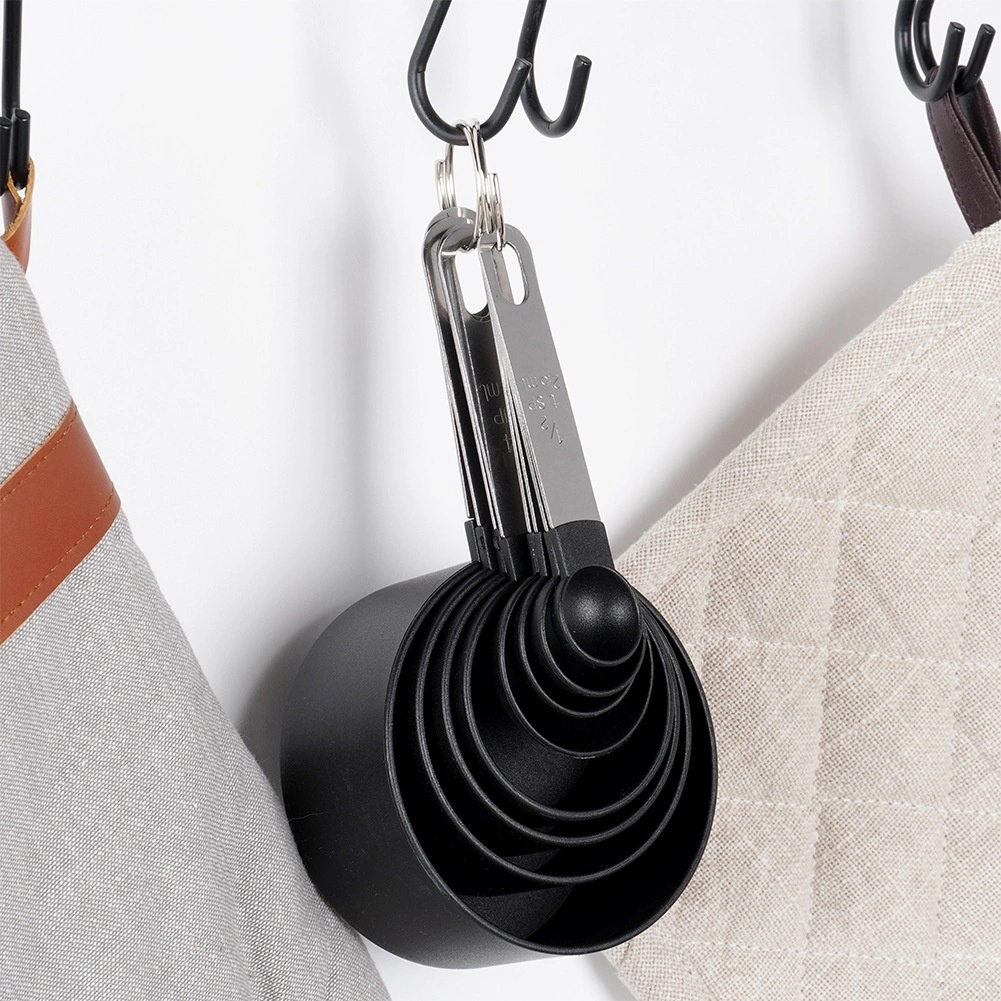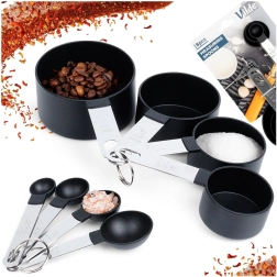 Miarki mają trwałe stalowe uchwyty oraz miseczki z wysokiej jakości plastiku w eleganckiej czerni. Można je myć w zmywarce. Wszystkie elementy są połączone metalowym kółkiem dla łatwego zawieszania i kompaktowego przechowywania w szufladzie.