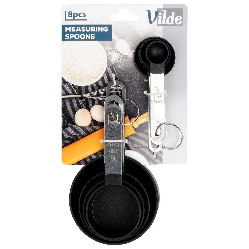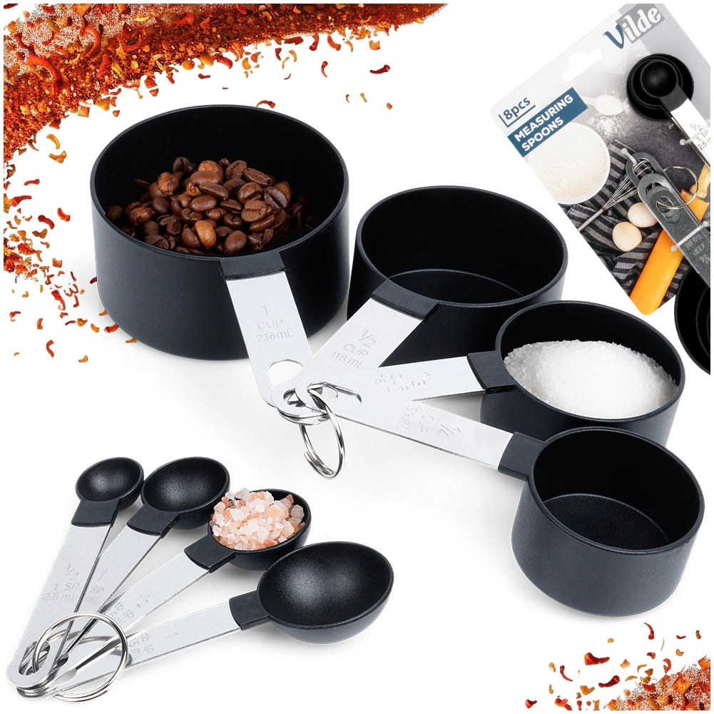 Cztery kubki i cztery łyżki obejmują najczęściej używane pojemności do gotowania i pieczenia – od 2,5 ml do 236 ml. Wyraźne oznaczenia ułatwiają pracę z przepisami.
