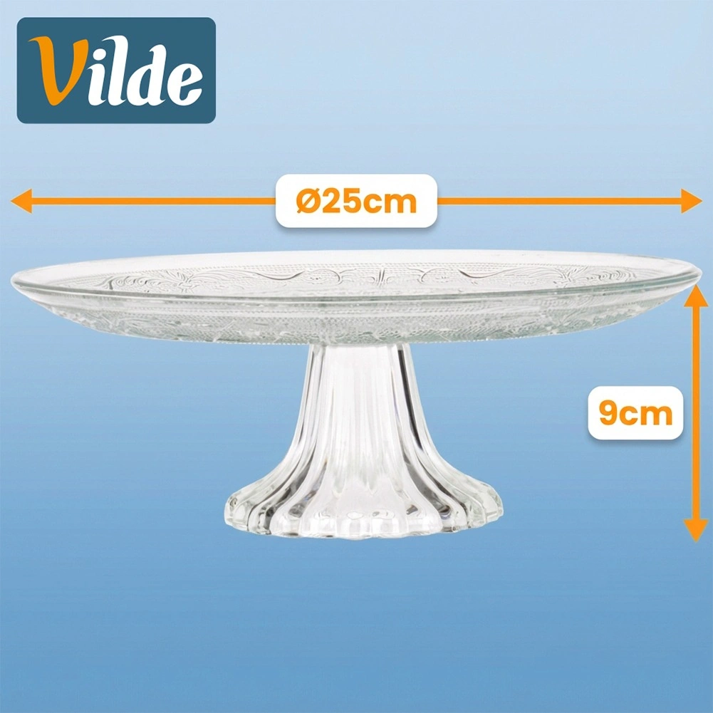 Elegancka szklana patera na nodze o średnicy 25 cm do stylowego serwowania tortów, ciast i deserów. Przezroczyste szkło ze zdobieniem przypomina kryształ i nadaje Twojemu stołowi luksusowy wygląd. Dzięki podwyższonej konstrukcji każdy deser pięknie się prezentuje, patera jest odporna na mycie w zmywarce i doskonale sprawdzi się w użytku domowym i profesjonalnym.