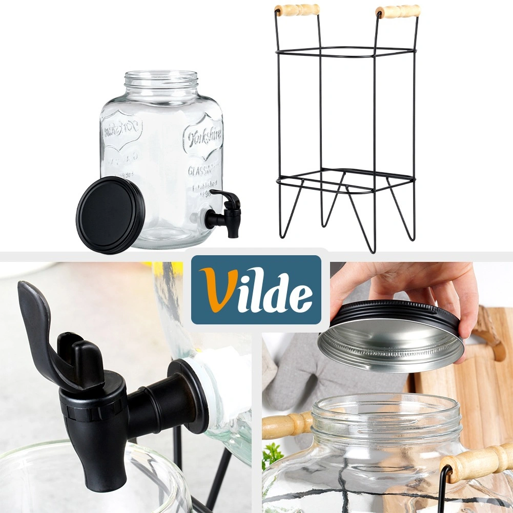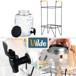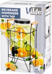 Szklany pojemnik wykonano z wysokiej jakości grubego szkła z dekoracyjnym tłoczeniem. Stojak i pokrywka są z metalu w czarnym kolorze, uchwyty z drewna, a kranik z wytrzymałego plastiku. Dyspenser nadaje się do wody z owocami, lemoniad, mrożonej herbaty oraz napojów z kostkami lodu. Nie jest przeznaczony do gorących napojów.