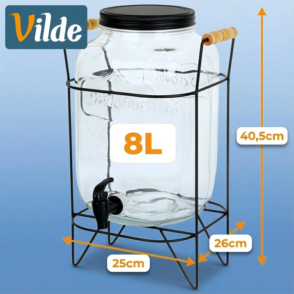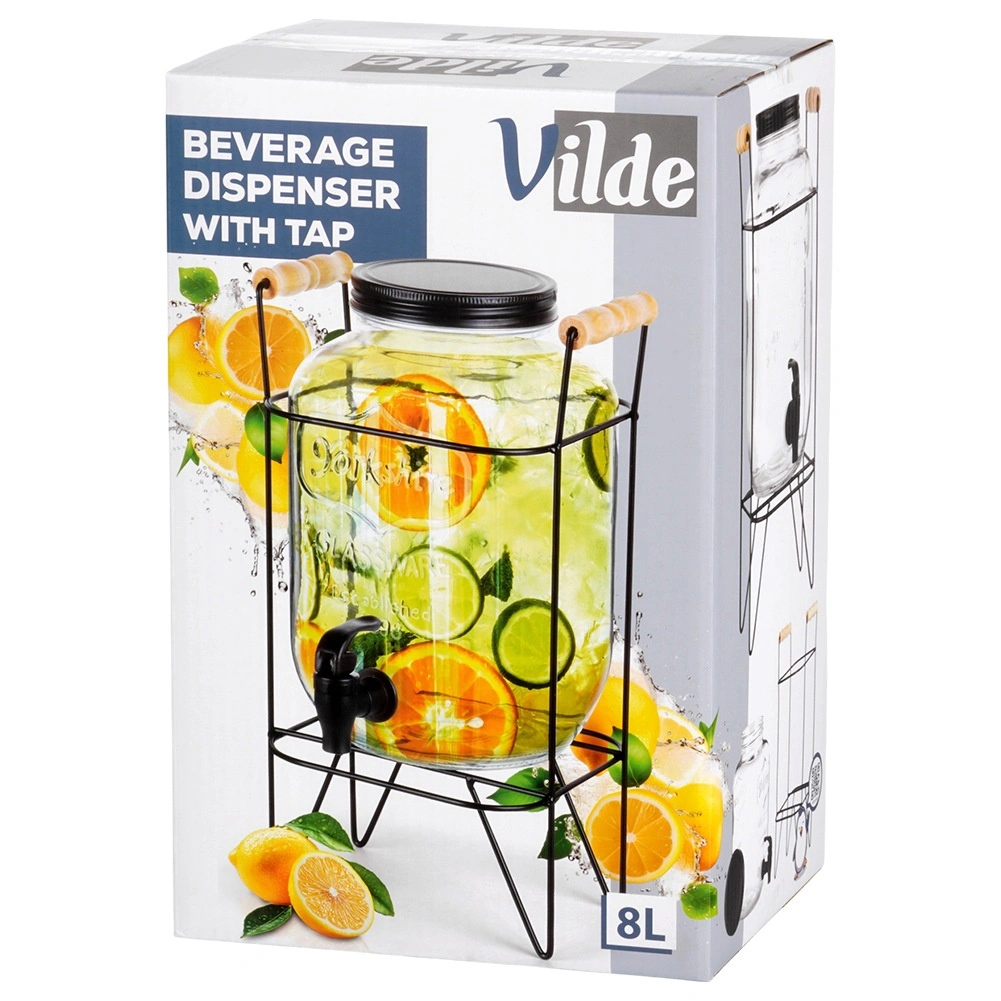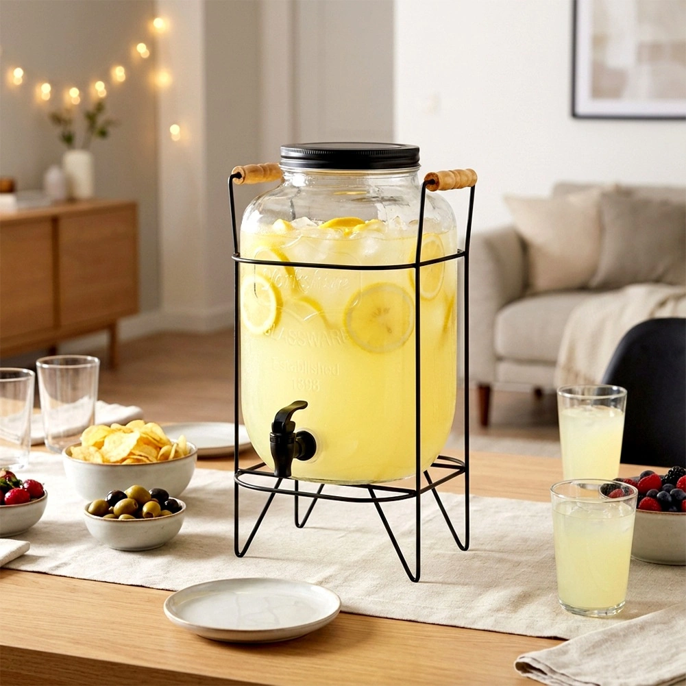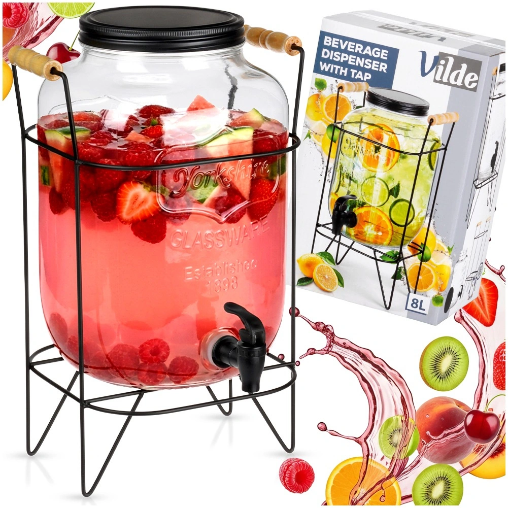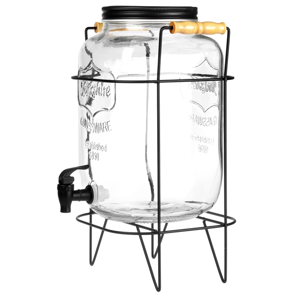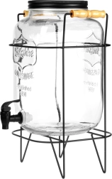 Elegancki szklany dyspenser do napojów 8 l ze stabilnym metalowym stojakiem i wygodnym kranikiem do łatwego nalewania. Wykonany z grubego szkła z efektownym reliefem, posiada metalową zakrętkę oraz stojak z drewnianymi uchwytami. Idealny do lemoniady, wody, mrożonej herbaty i ponczu na przyjęcia w ogrodzie i do domu.
