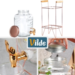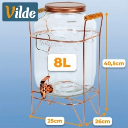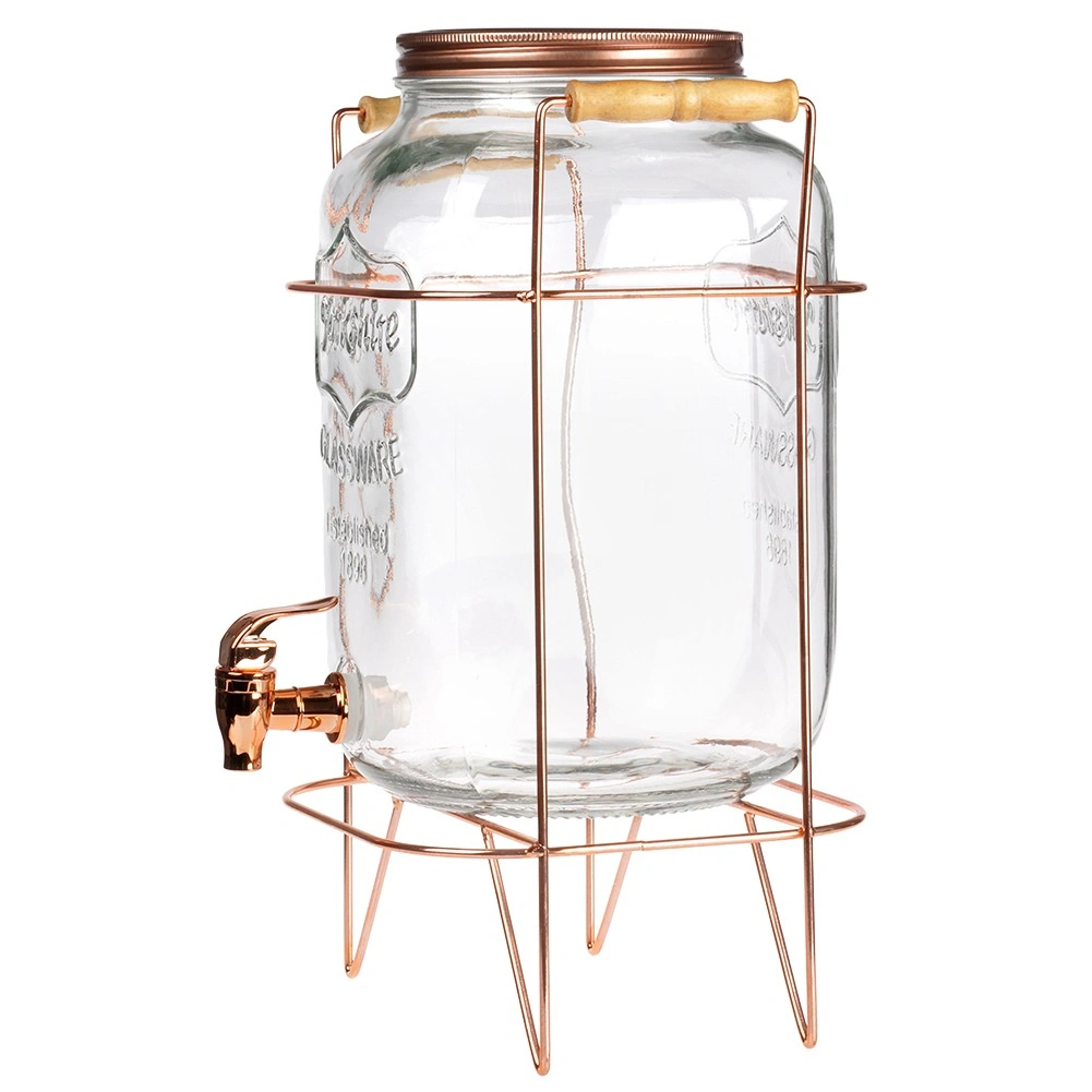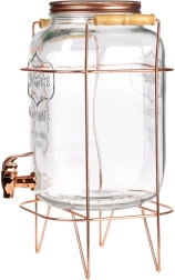Zestaw zawiera szklany słój/dyspenser, metalowy stojak oraz metalową zakręcaną pokrywkę w kolorze różowego złota. Odpowiedni do wody, domowych lemoniad, wód smakowych, soków, mrożonej herbaty i ponczu. Doskonale pasuje do ogrodu, na taras i do wnętrz.
