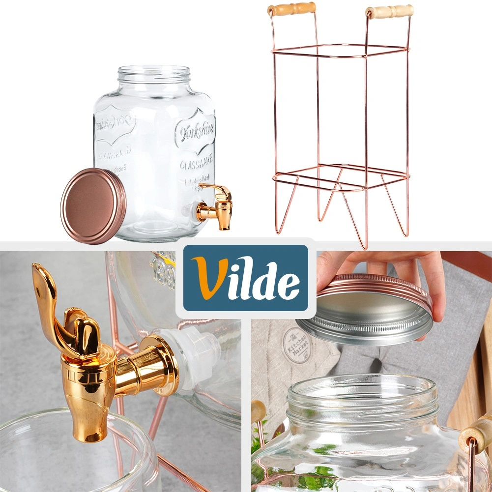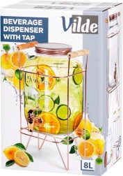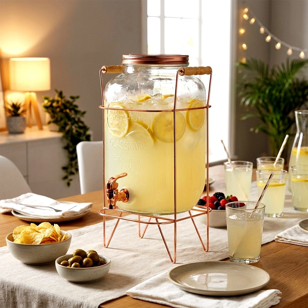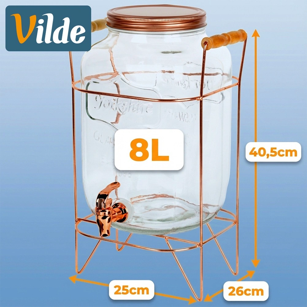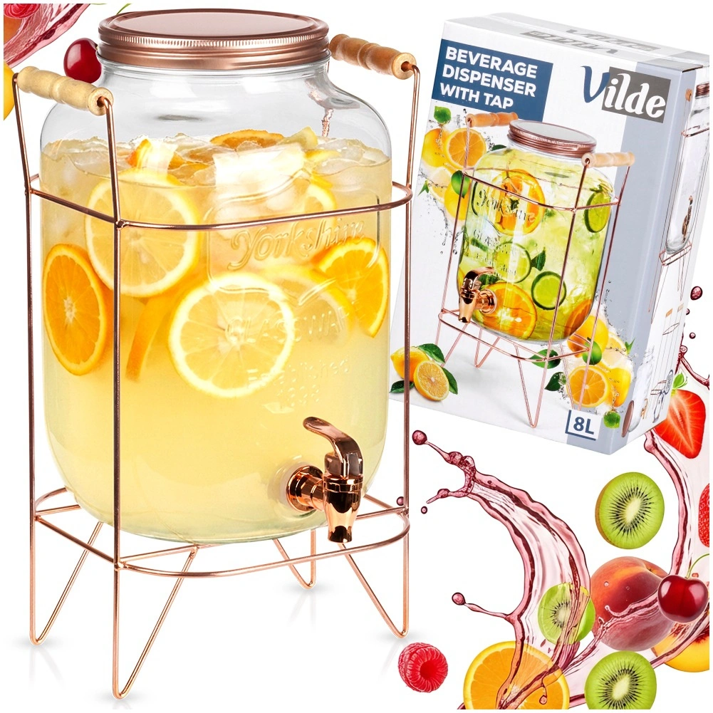 Stylowy szklany dyspenser o pojemności 8 l ze stabilnym metalowym stojakiem w kolorze różowego złota jest idealny do serwowania lemoniady, ponczu czy mrożonej herbaty. Dzięki szerokiemu wlewowi łatwo napełnisz napój razem z owocami i lodem, praktyczny kranik zapewni wygodne nalewanie, a zakręcana pokrywka ochroni zawartość przed zanieczyszczeniami i owadami. Wytrzymałe szkło, elegancki design oraz wygodne drewniane uchwyty na stojaku sprawiają, że ten dyspenser to doskonały wybór na przyjęcia w ogrodzie i domowe uroczystości.
