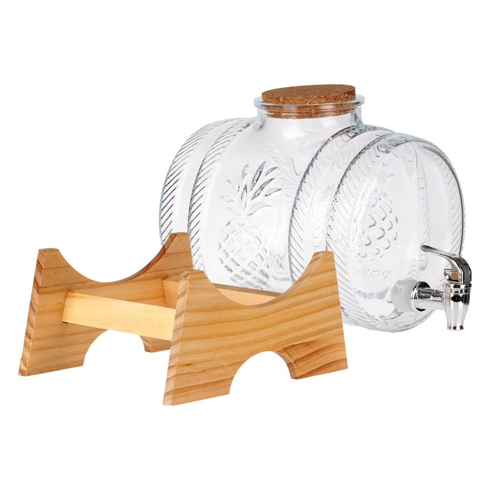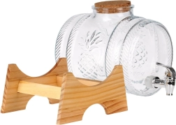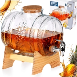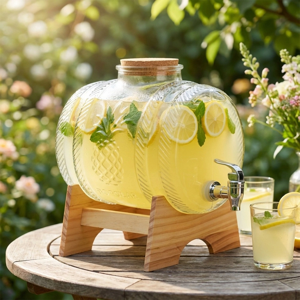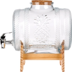Ten elegancki dystrybutor napojów łączy wysokiej jakości grube szkło z dekoracyjnym tłoczeniem ananasa, metalowy kranik do płynnego nalewania oraz drewnianą podstawkę dla stabilności i komfortu. Dzięki pojemności 5 litrów jest perfekcyjny na przyjęcia w ogrodzie, rodzinne uroczystości i stylowe bufety. Korkowa pokrywka utrzymuje napój świeży i bez owadów.