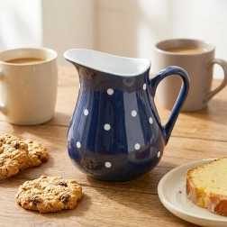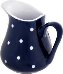 Stylowy ceramiczny dzbanek o pojemności 480 ml w ciemnoniebieskim kolorze z białymi kropkami idealnie nadaje się do serwowania mleka, śmietanki, napojów i sosów. Ma ergonomiczne ucho oraz profilowany dzióbek do precyzyjnego nalewania bez rozchlapywania, jest odpowiedni do zmywarki i mikrofalówki i świetnie uzupełni każdy stół.