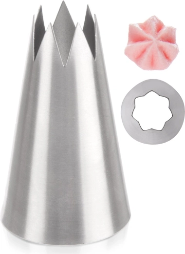 Uniwersalna nierdzewna tylka cukiernicza w kształcie kwiatu do łatwego dekorowania tortów, babeczek i deserów. Dzięki szerokiemu otworowi tworzy efektowne kwiatowe wzory, jest trwała, bezpieczna dla zdrowia i odpowiednia do zmywarki. Kompatybilna z workami cukierniczymi jednorazowymi i wielorazowymi.