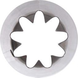 Nierdzewna tylka cukiernicza w kształcie gwiazdy do łatwego i efektownego dekorowania tortów, ciast i babeczek. Wykonana z wysokiej jakości stali nierdzewnej, jest wytrzymała, bezpieczna w kontakcie z żywnością i odpowiednia do zmywarki. Pasuje do wszystkich typów rękawów cukierniczych – jednorazowych i wielorazowych.