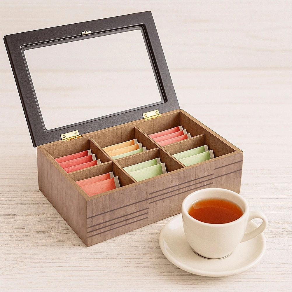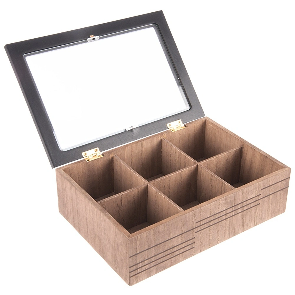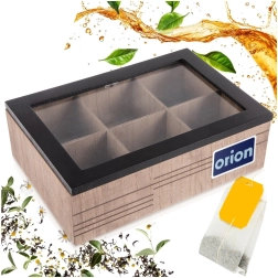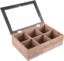 - 6 przegródek do oddzielania różnych herbat (ok. 7,5 × 7,5 × 5,5 cm każda)