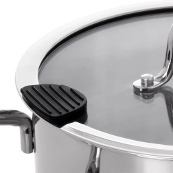 - Szklana pokrywka z dziobkiem i silikonem – bezpieczne odcedzanie i kontrola procesu gotowania.