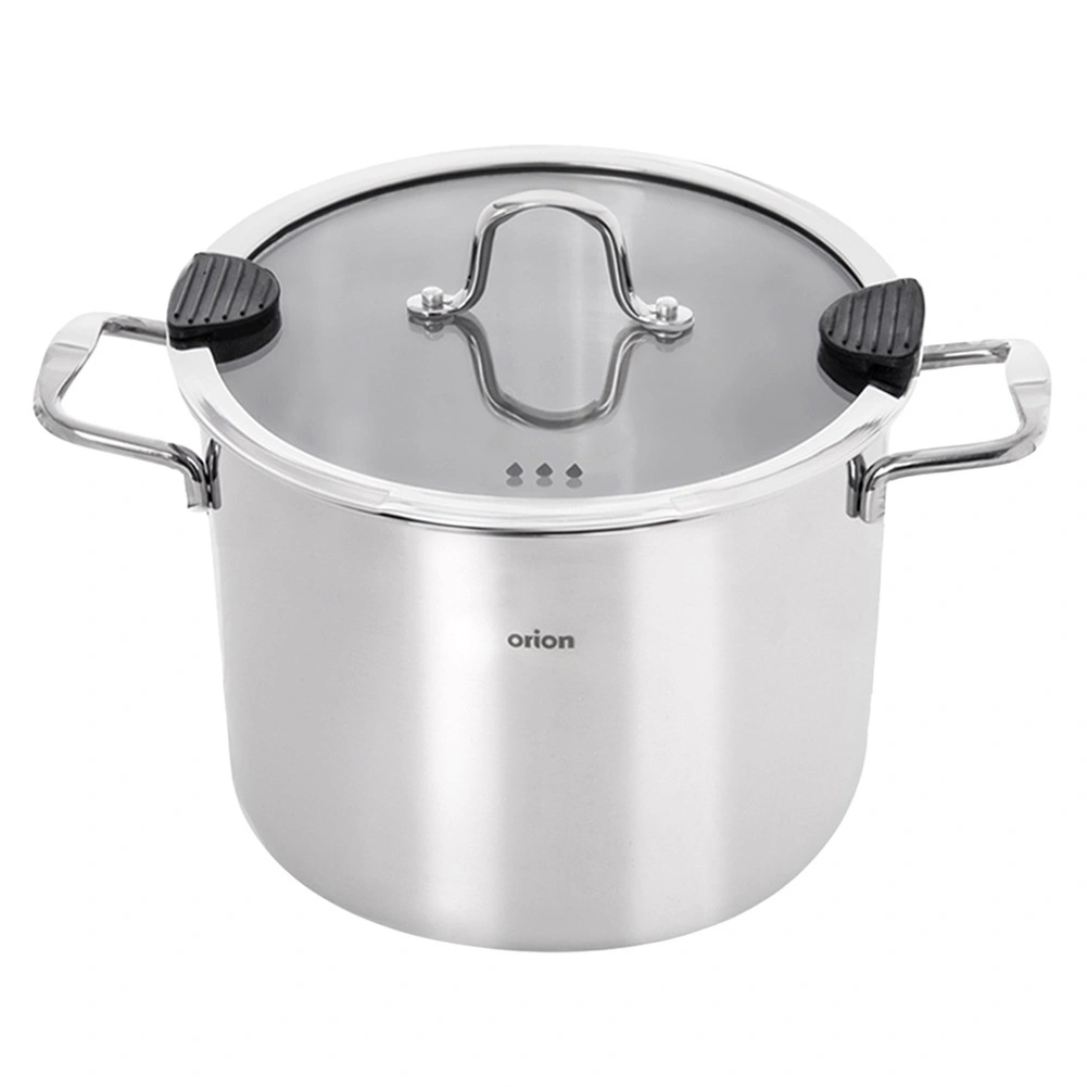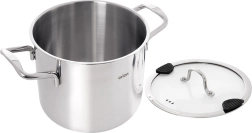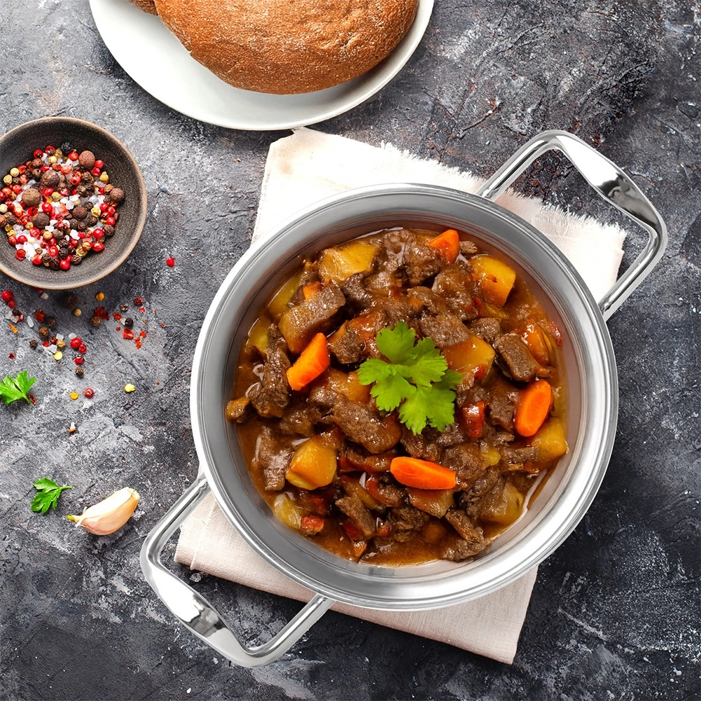 Odkryj niezawodny garnek do zup, gulaszy i jednogarnkowych dań. Solidna stal nierdzewna 304 jest łatwa w utrzymaniu, szklana pokrywka umożliwia kontrolę gotowania, a praktyczny dzióbek z silikonowymi elementami ułatwia bezpieczne odlewanie wody. Wielowarstwowe dno z aluminium zapewnia równomierną dystrybucję ciepła i oszczędne gotowanie.
