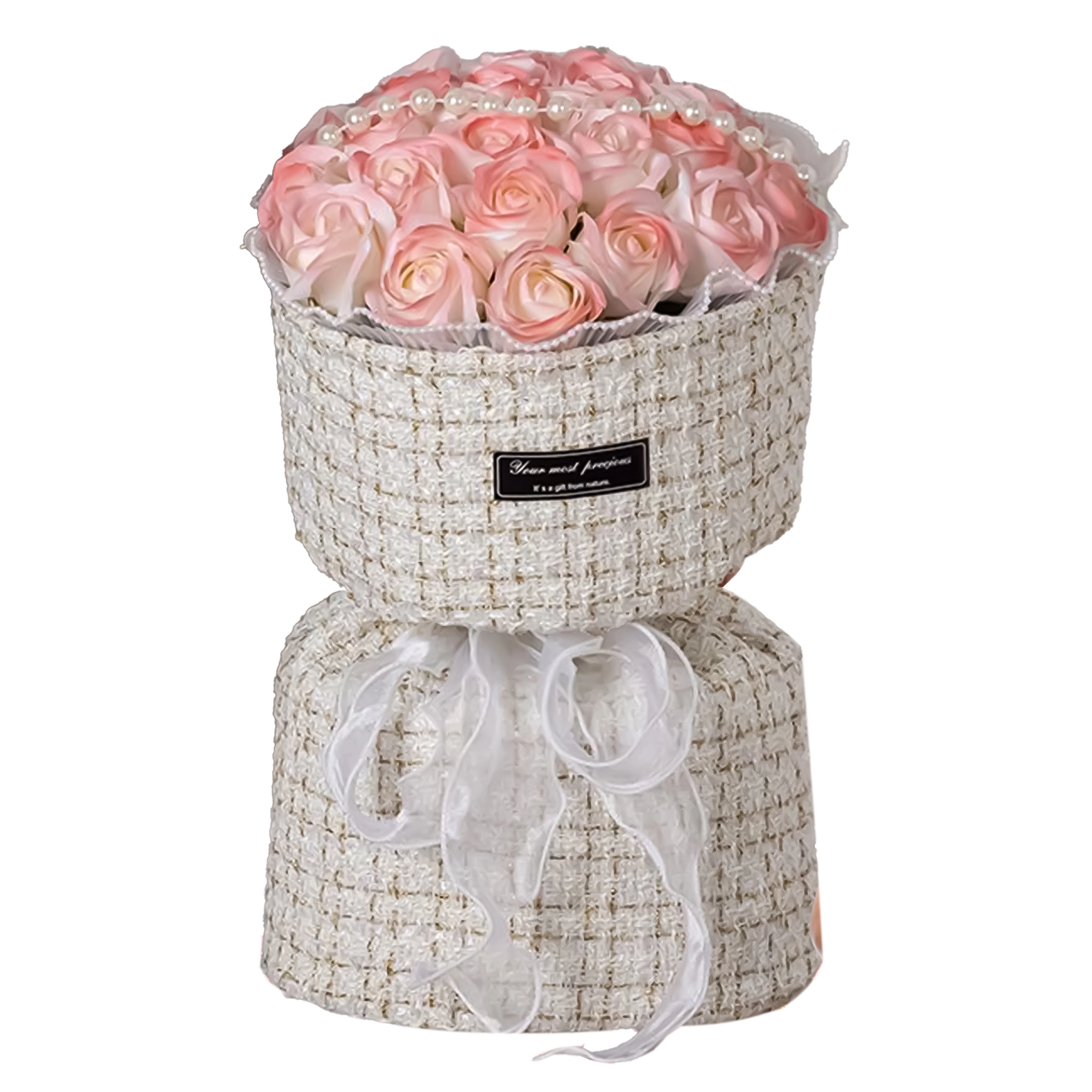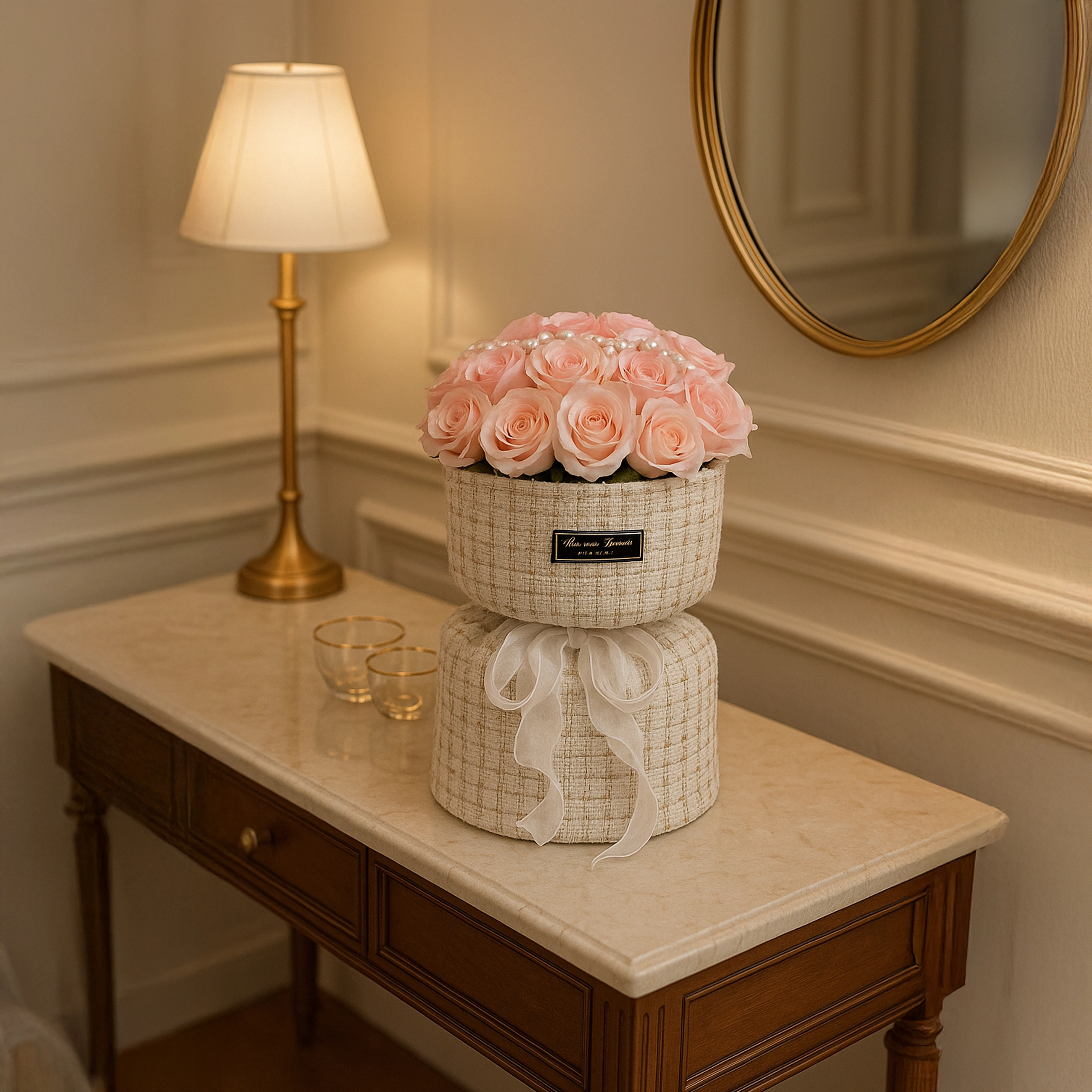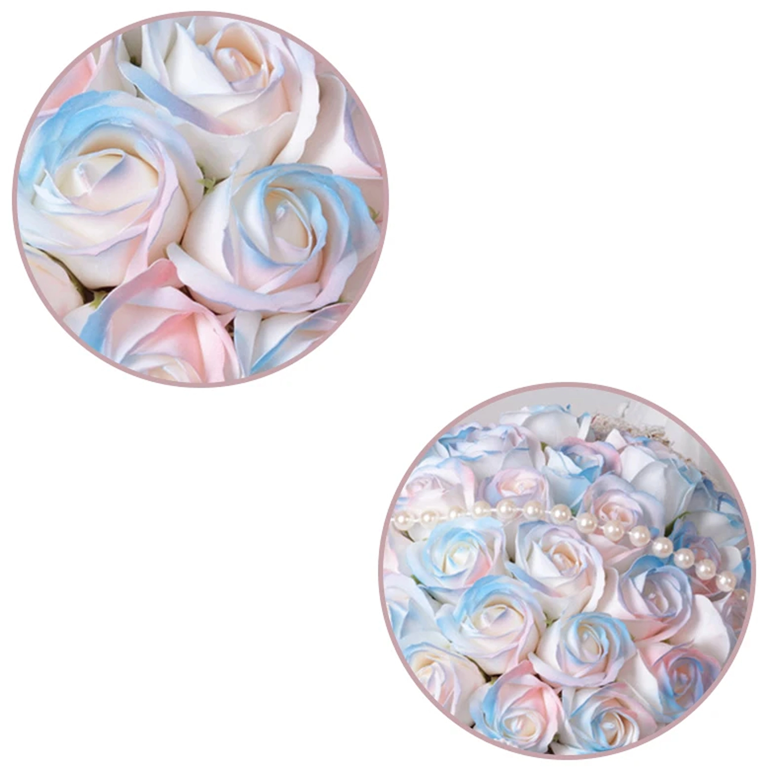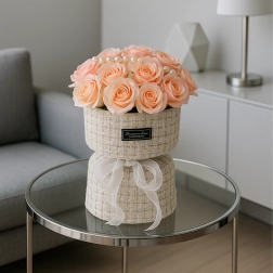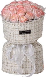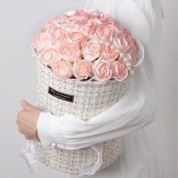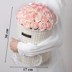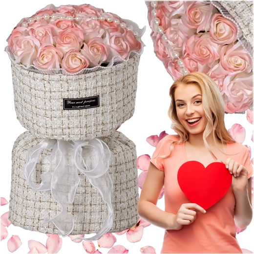 Ten elegancki zestaw różowych mydlanych róż w tekstylnym pudełku kapeluszowym wnosi romantyczny nastrój na każdy stół, komodę czy stolik kawowy. Subtelne odcienie różu, podkreślone perełkami i światełkami LED, tworzą wyrafinowaną aranżację, która wygląda jak świeża, lecz nie wymaga żadnej pielęgnacji.