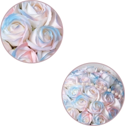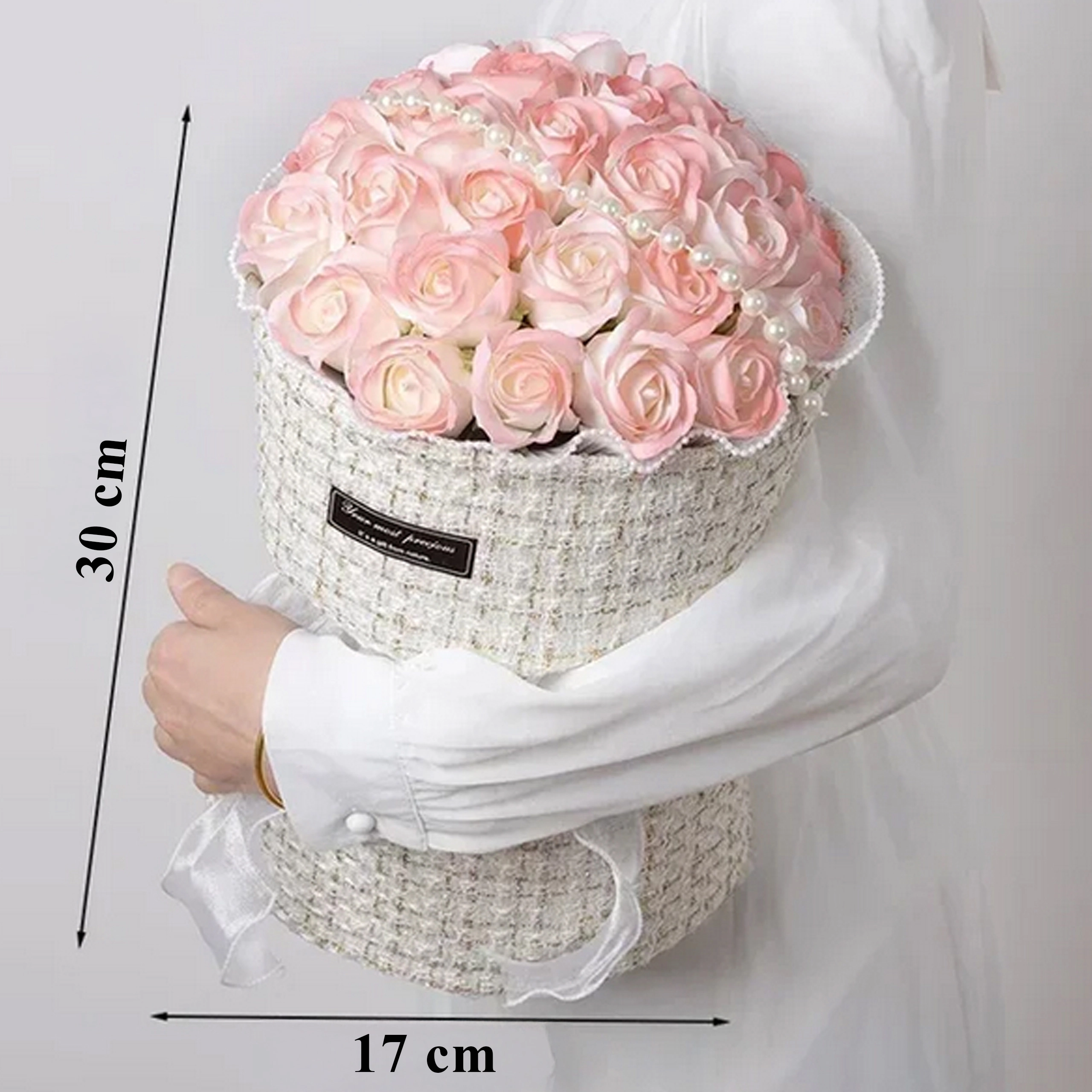 Starannie odwzorowane kwiaty z perełkami tworzą bogatą kompozycję, która zachowuje kształt i nie wymaga żadnej pielęgnacji.