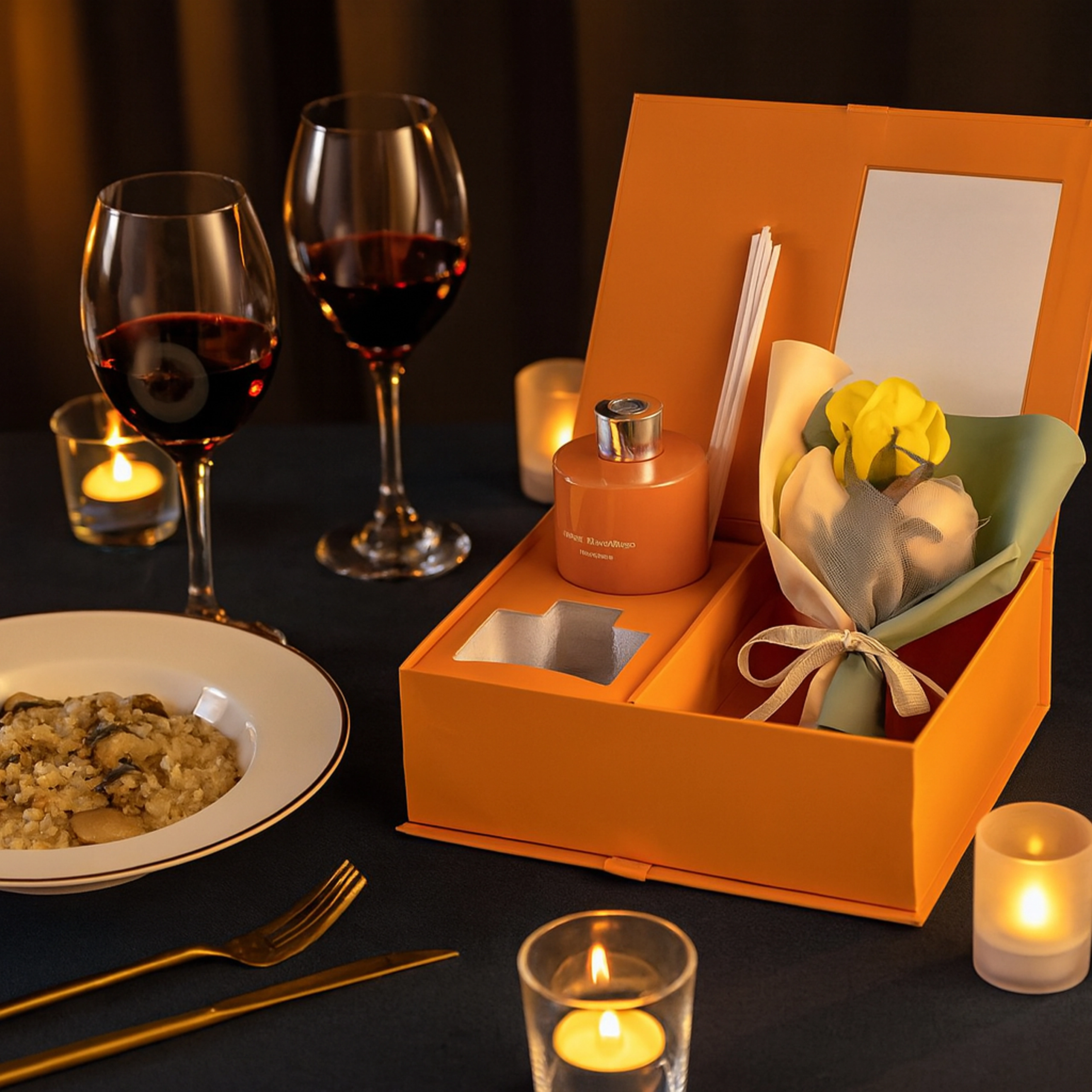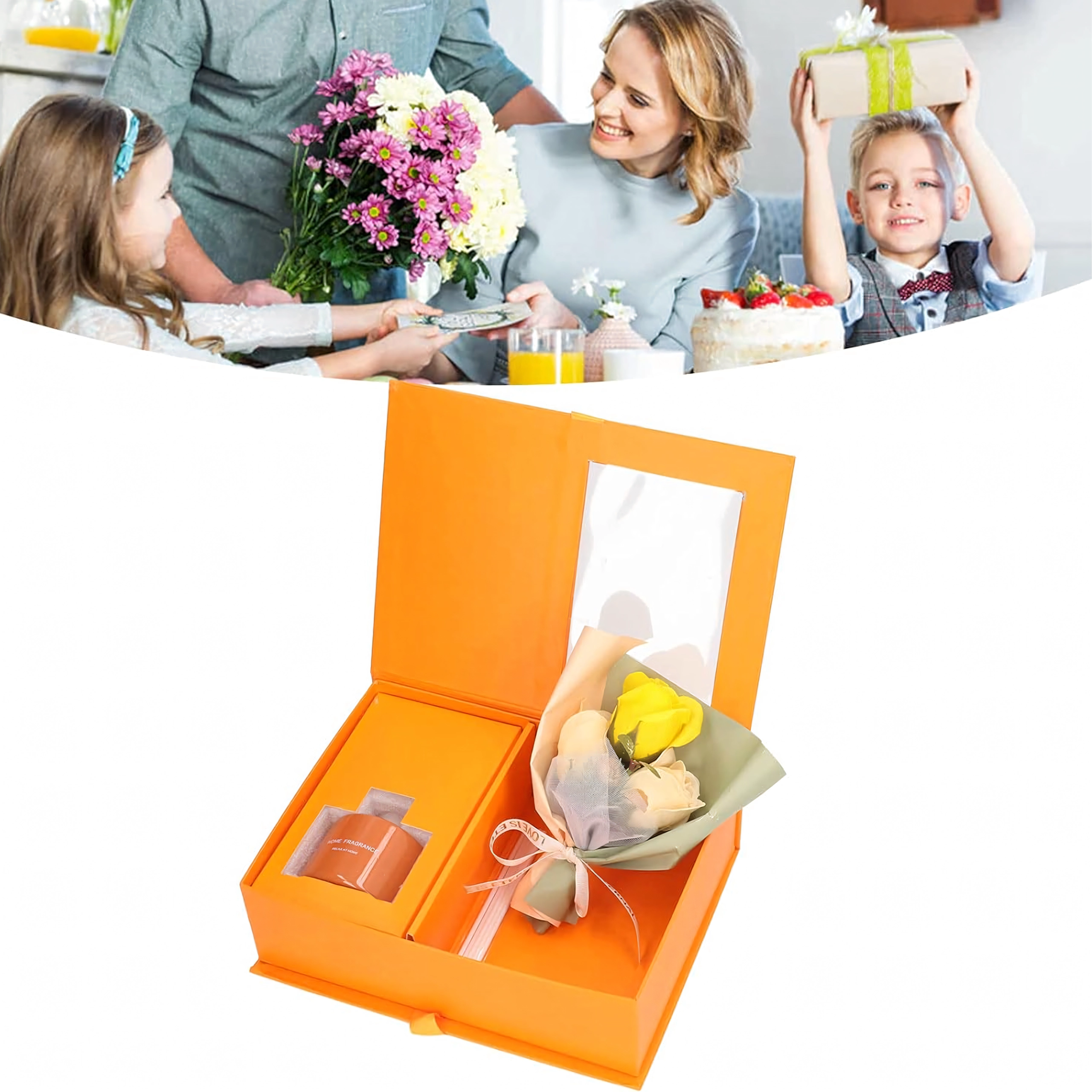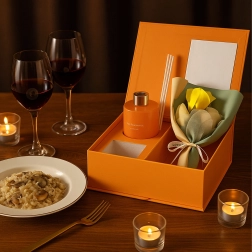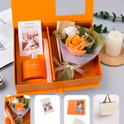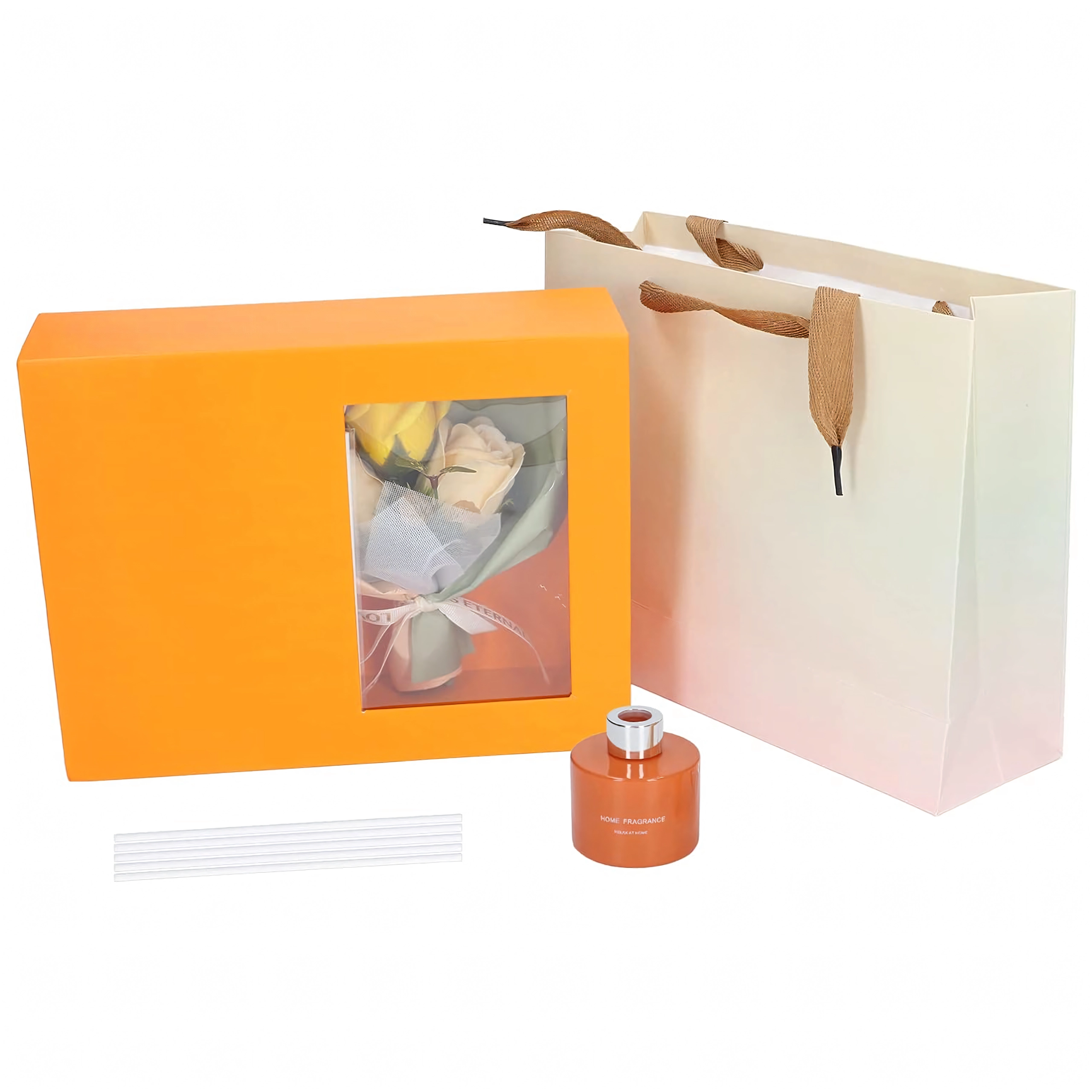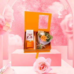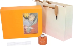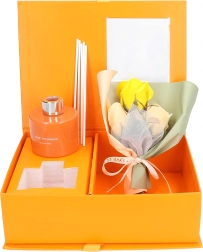 Elegancki zestaw prezentowy łączy zapach i design: pomarańczowy dyfuzor patyczkowy zapewniający nieprzerwane aromatyzowanie domu oraz dekoracyjne róże jako subtelny dodatek. Idealny prezent na Dzień Kobiet, Walentynki lub jako podziękowanie nauczycielom – ucieszy zmysły, ociepli wnętrze i pozostawi długotrwały, świeży aromat.