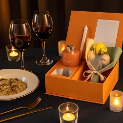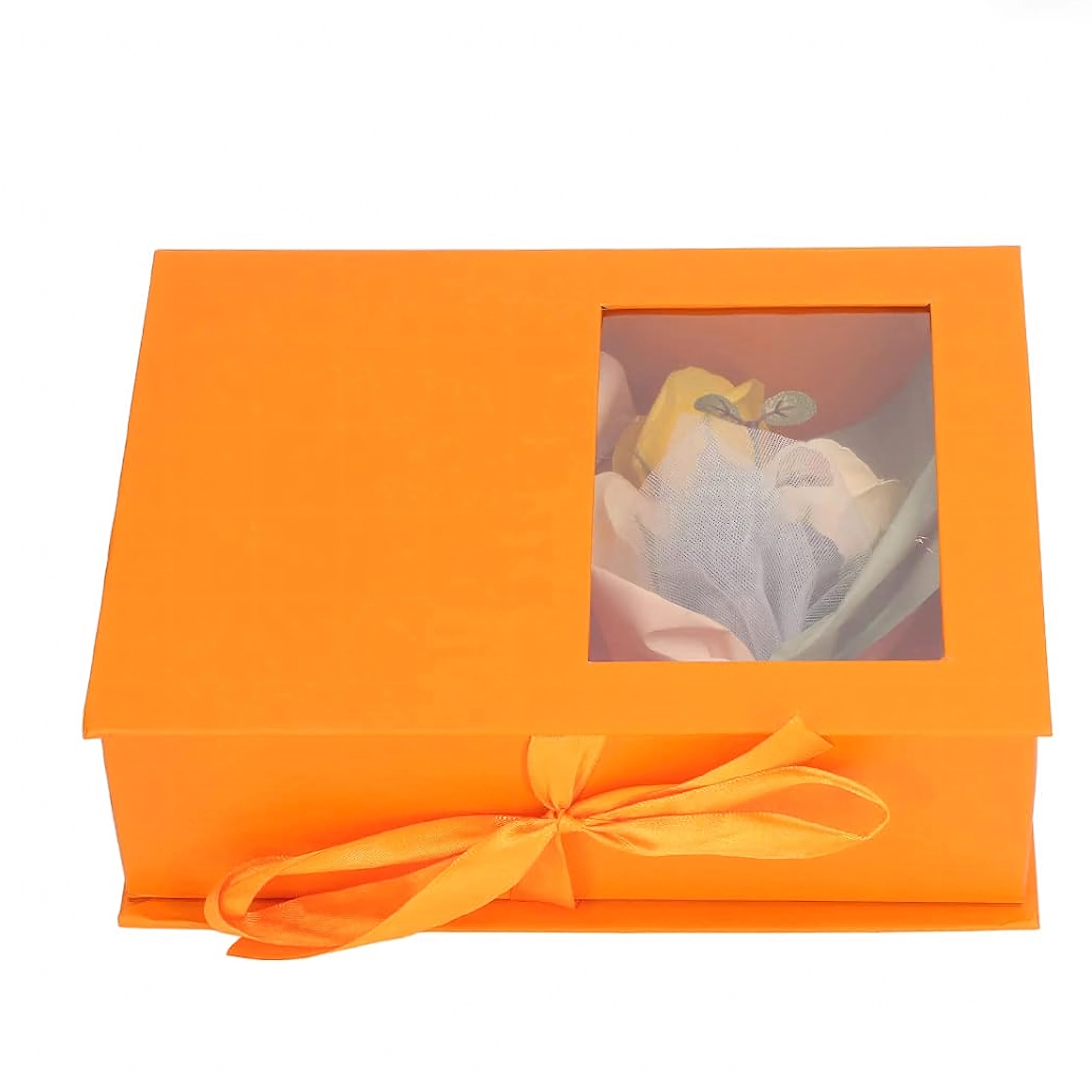 Solidne pomarańczowe pudełko z okienkiem i kokardą prezentuje się reprezentacyjnie; w zestawie znajduje się mały bukiecik dekoracyjnych róż, dzięki czemu całość wygląda spójnie i elegancko.