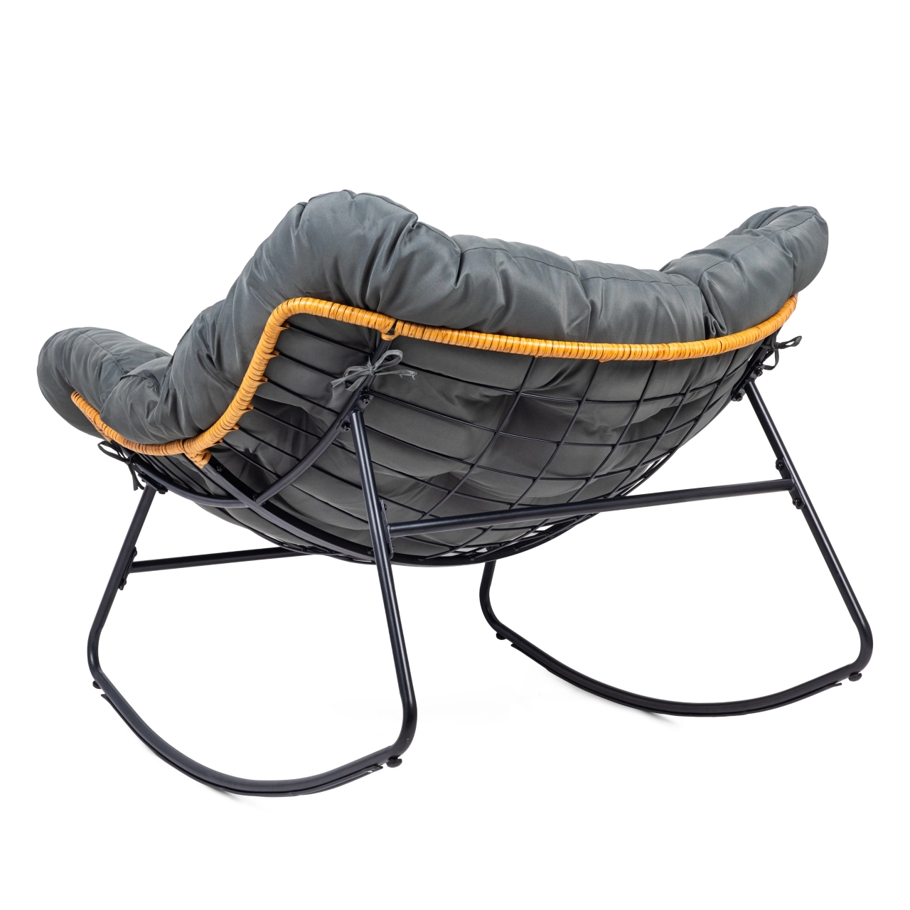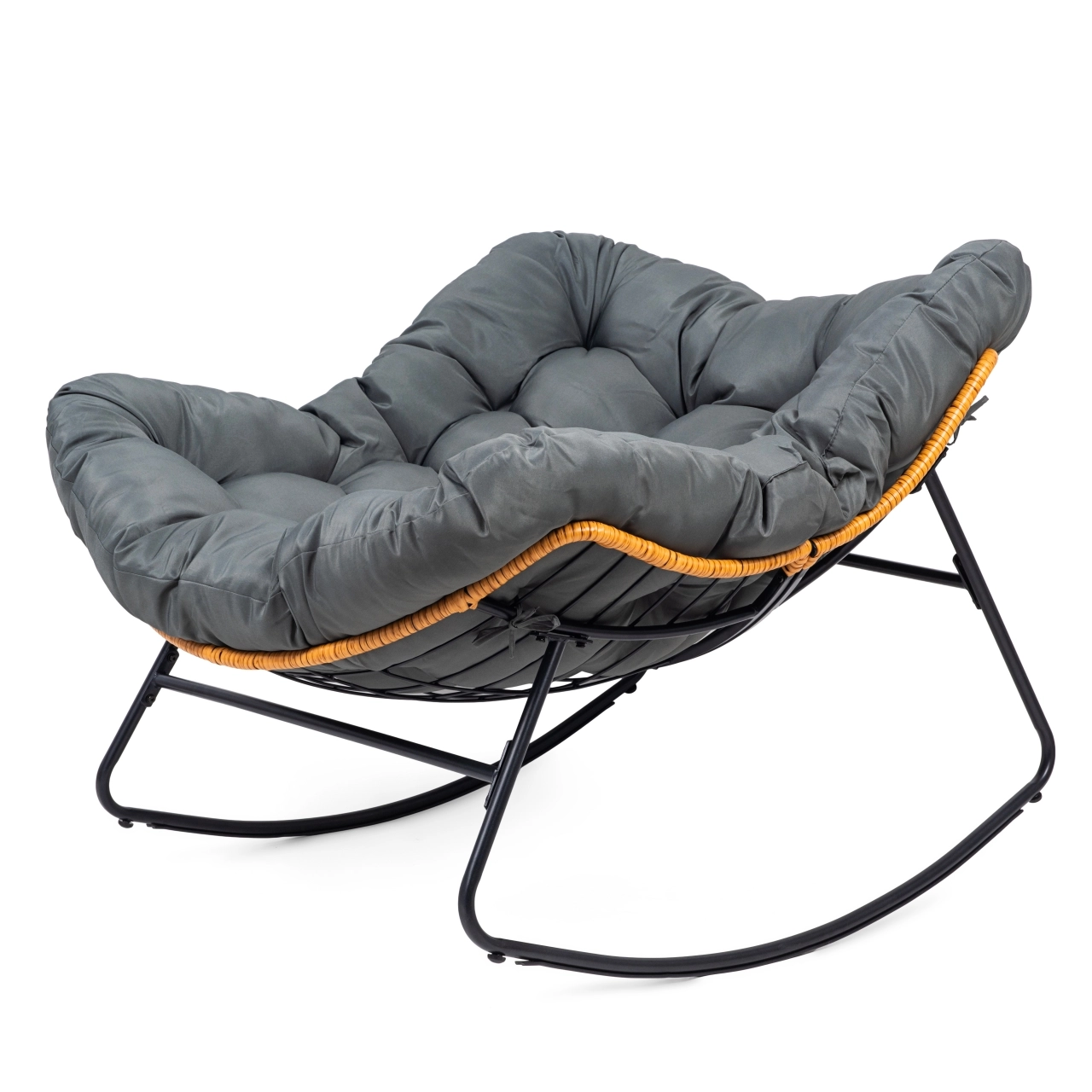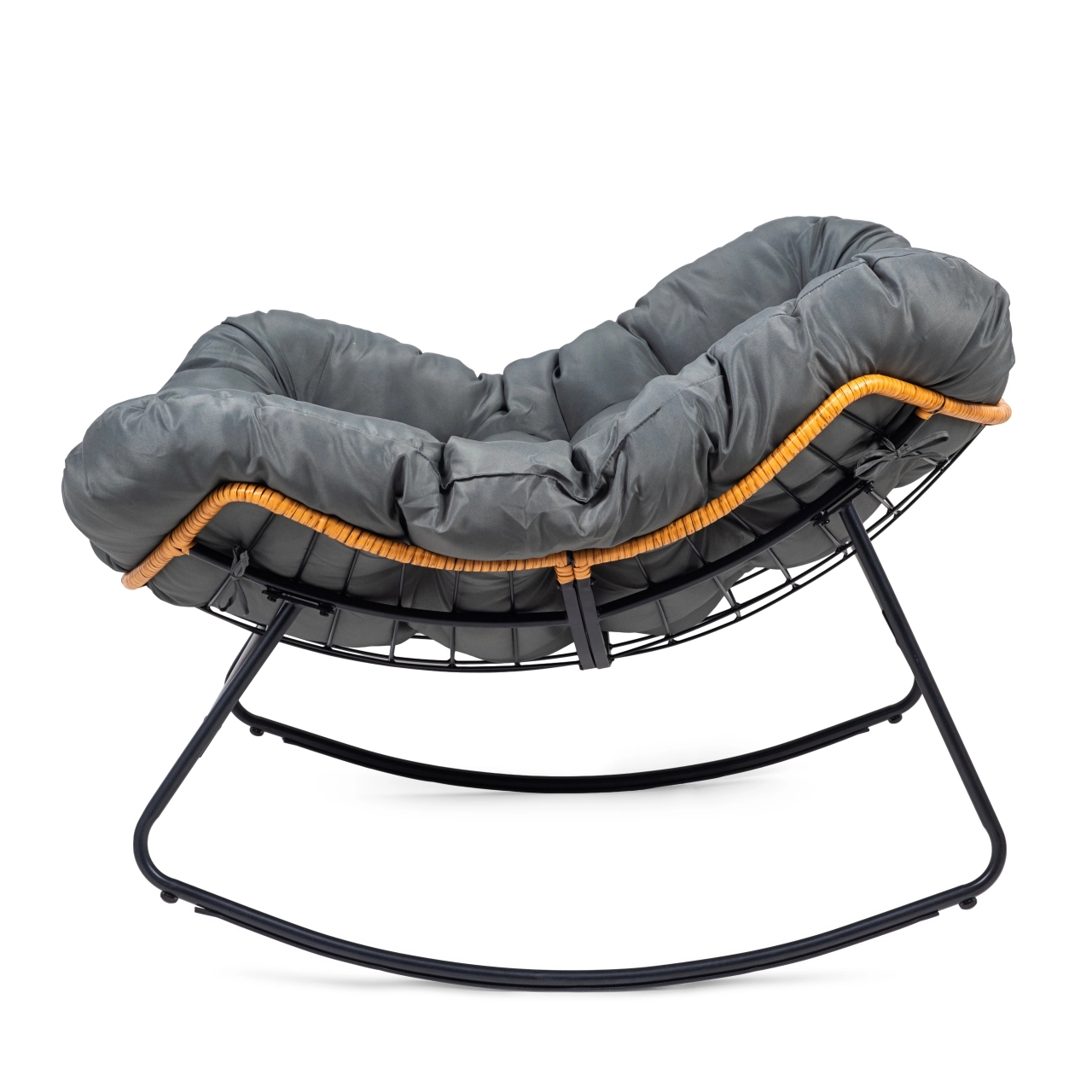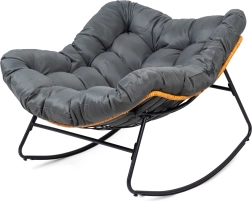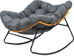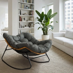 Stwórz w domu własną strefę relaksu. Ten fotel bujany XL oferuje głębokie i przestronne siedzisko, miękką, pikowaną poduchę oraz delikatny, kojący ruch bujania, który pomaga rozluźnić ciało i umysł. Neutralna szarość łatwo współgra z drewnem, czarnym metalem i naturalnymi dodatkami, a dzięki przewiewnej konstrukcji nie przytłacza nawet mniejszych wnętrz.