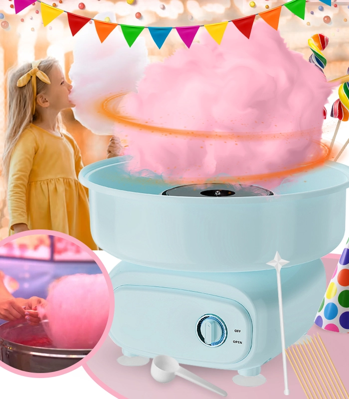 Sprowadź klimat jarmarcznych słodkości prosto do domu! Ten niebieski elektryczny automat do waty cukrowej w kilka chwil przygotuje lekką i puszystą watę jak z wesołego miasteczka. Obsługa jednym przełącznikiem ON/OFF, stabilne przyssawki dla bezpiecznej pracy oraz nieprzywierająca misa dla łatwego czyszczenia – idealny na uroczystości, przyjęcia i rodzinne wieczory.