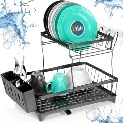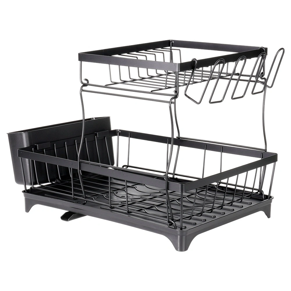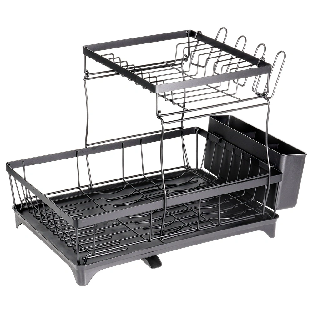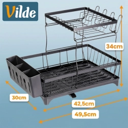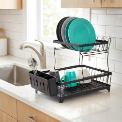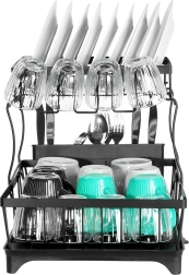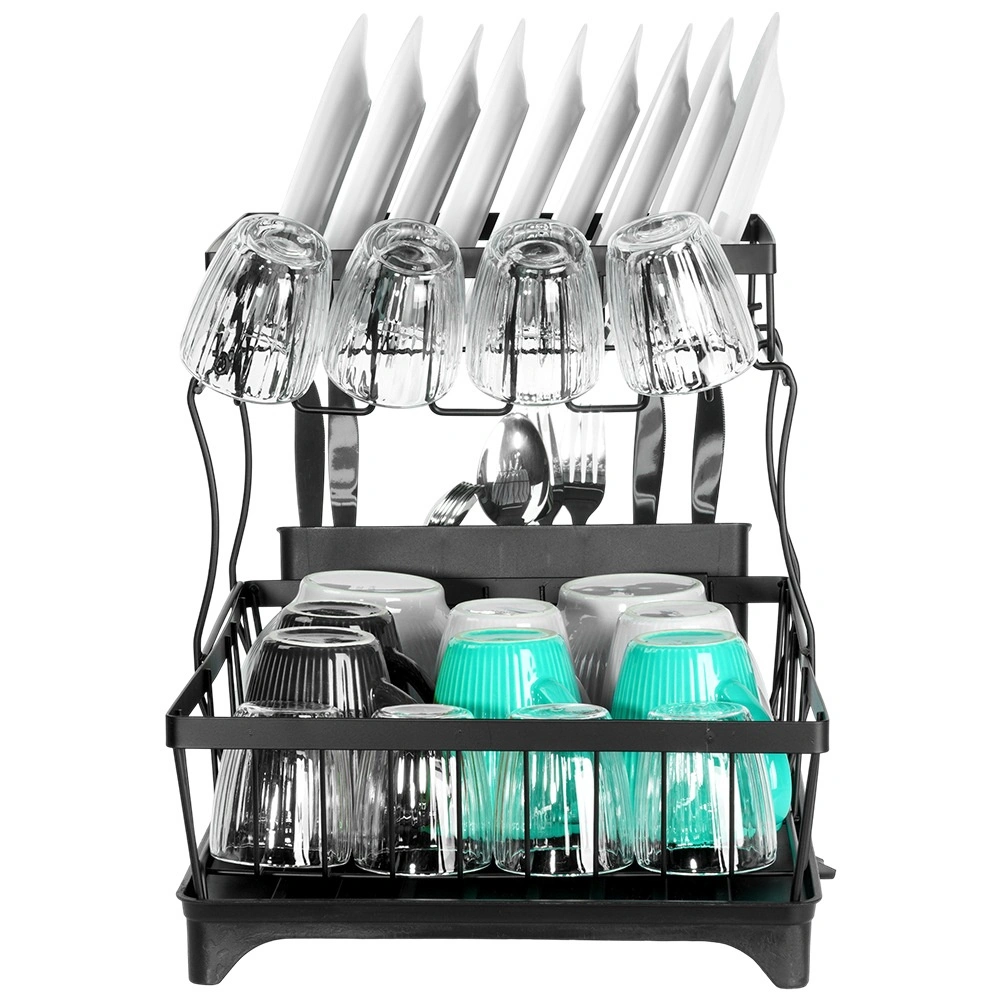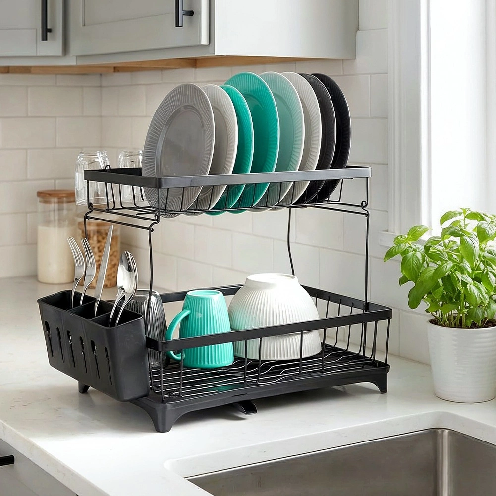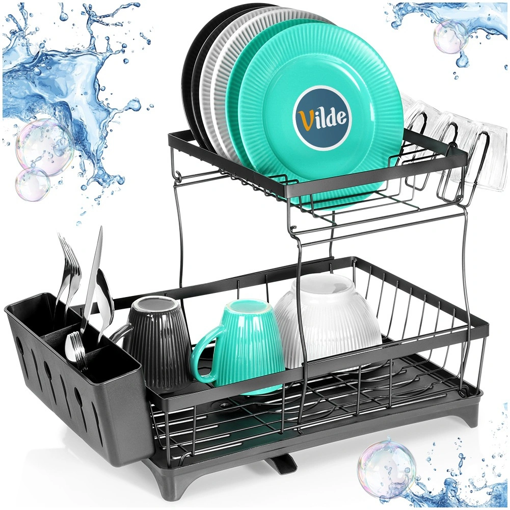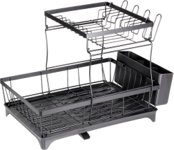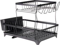 Dwupoziomowa suszarka do naczyń w eleganckim czarnym kolorze oferuje dużą pojemność, solidną metalową konstrukcję oraz praktyczną tackę ociekową z wylewką. Porządkuje talerze, miski, szklanki i sztućce, a jednocześnie chroni blat kuchenny przed wodą.