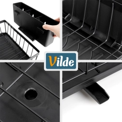Metalowa konstrukcja w matowej czerni jest trwała i łatwa w utrzymaniu, a dolna plastikowa tacka ociekowa z zintegrowaną wylewką odprowadza wodę kontrolowanie prosto do zlewu, pomagając utrzymać kuchnię w suchości i czystości. Nowoczesny, industrialny design pasuje do nowoczesnych i klasycznych kuchni.