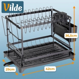 Praktyczna dwupoziomowa suszarka do naczyń o wymiarach 42 × 29 × 36,5 cm zapewnia szybkie i uporządkowane suszenie talerzy, szklanek i sztućców. Ma solidną metalową konstrukcję w matowej czerni, wyjmowany ociekacz na sztućce z czterema przegródkami oraz uchwyt na deskę. Taca z odpływem odprowadza wodę z powrotem do zlewu, dzięki czemu blat kuchenny pozostaje suchy. Idealna do oszczędzania miejsca i zorganizowanego suszenia w każdej kuchni.