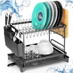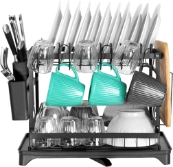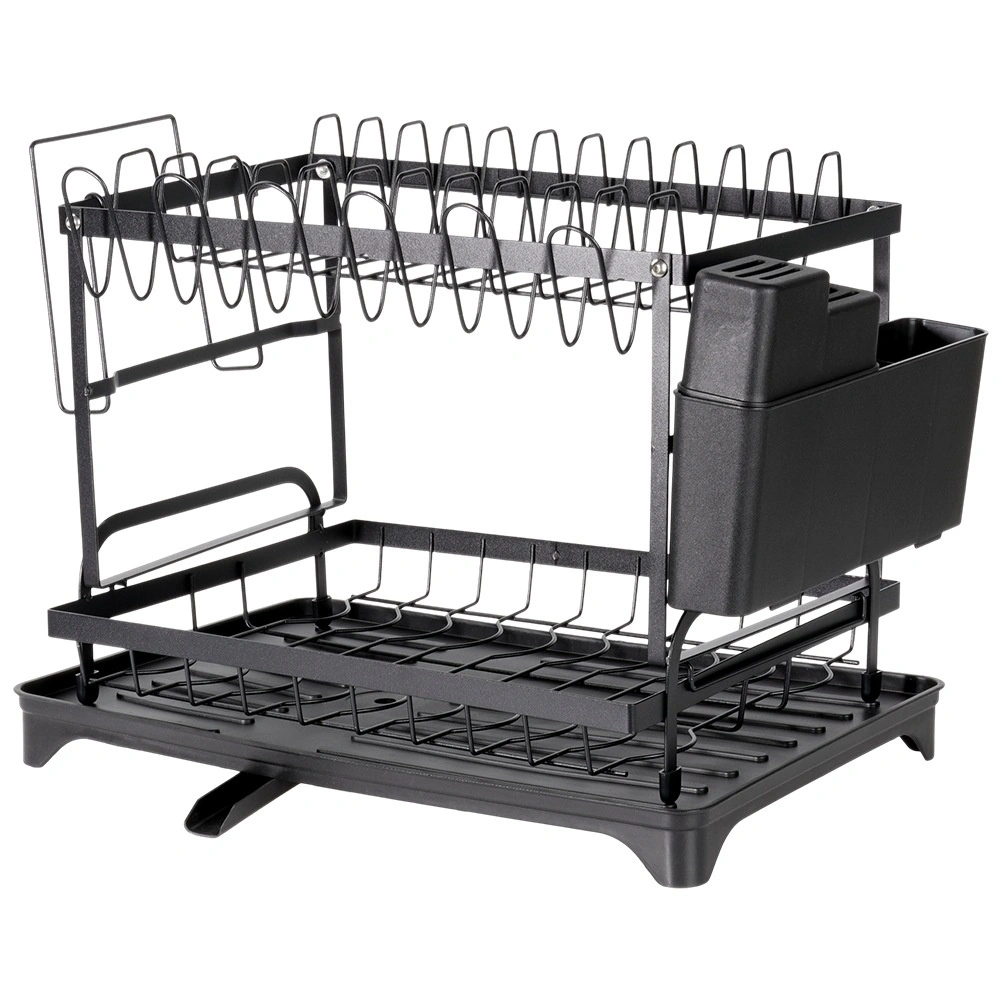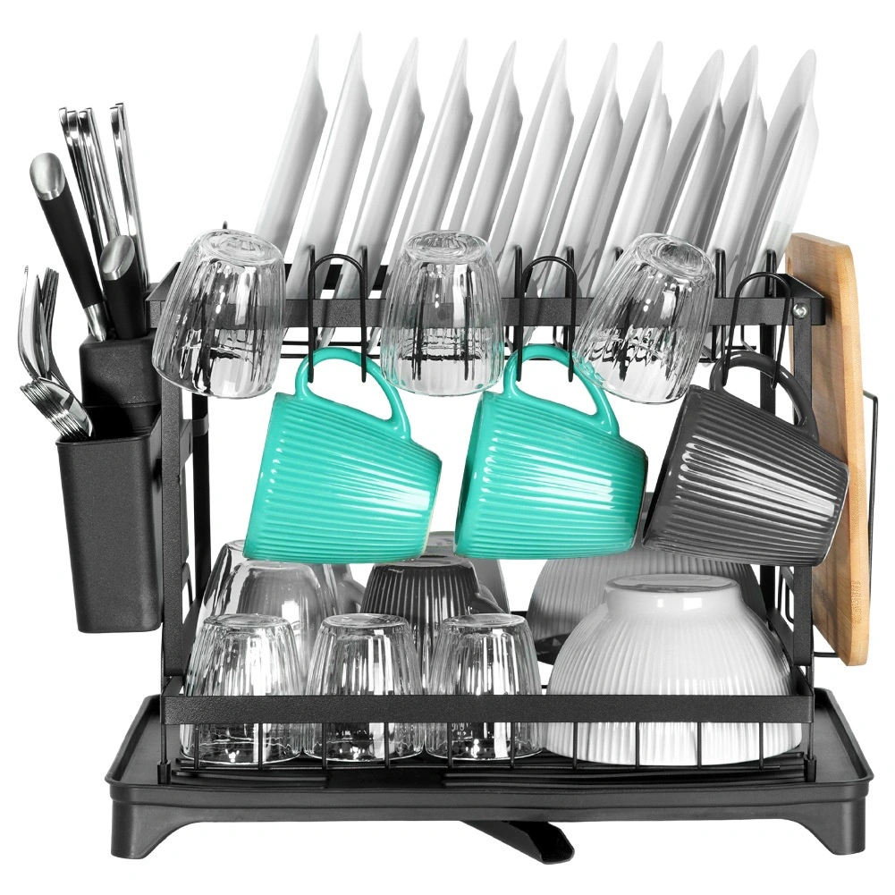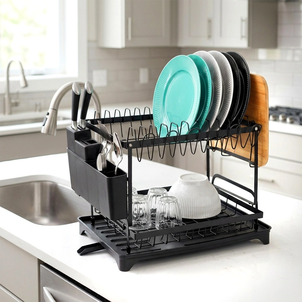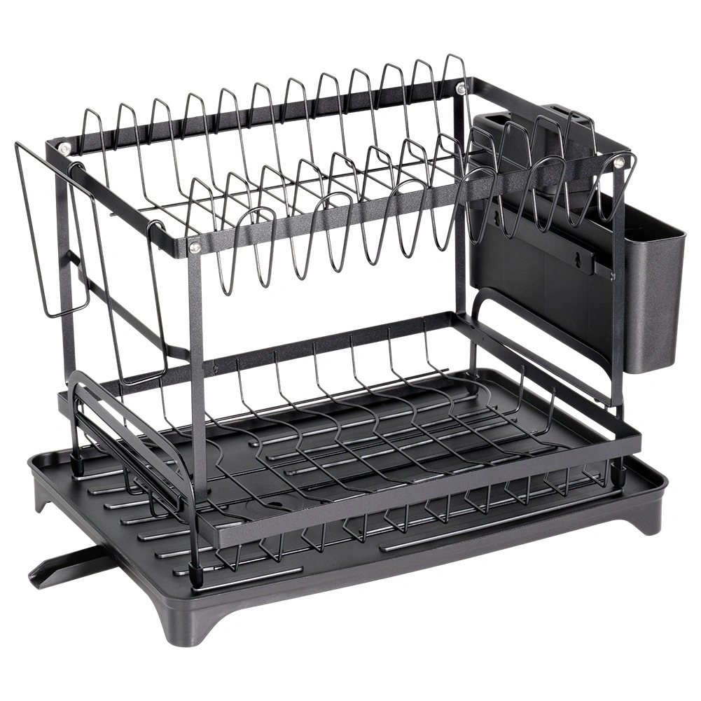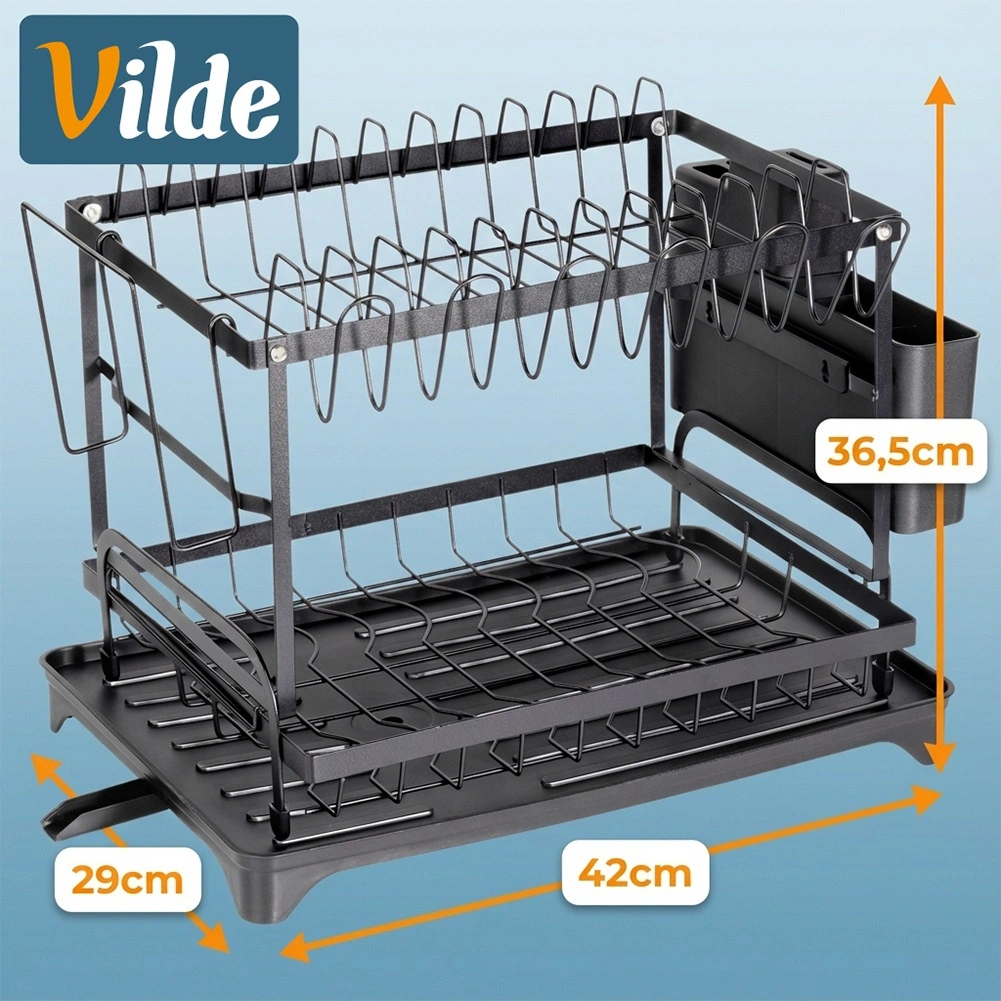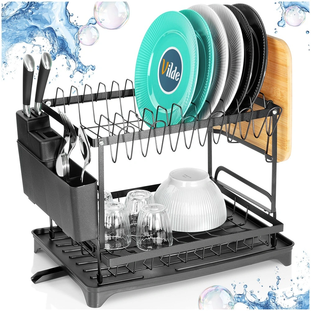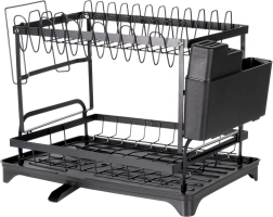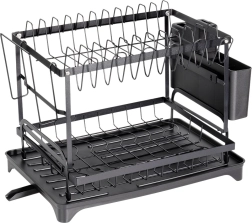 Elegancka i wytrzymała, dwupoziomowa metalowa suszarka do naczyń w matowej czerni oferuje dużą pojemność i przemyślane rozmieszczenie. Górny poziom mieści do 11 talerzy, dolny jest idealny na miski, kubki i szklanki. W zestawie znajduje się odłączany pojemnik na sztućce z 4 komorami (jedna na noże), boczny uchwyt na deskę do krojenia oraz taca z odpływem do kontrolowanego odprowadzania wody.