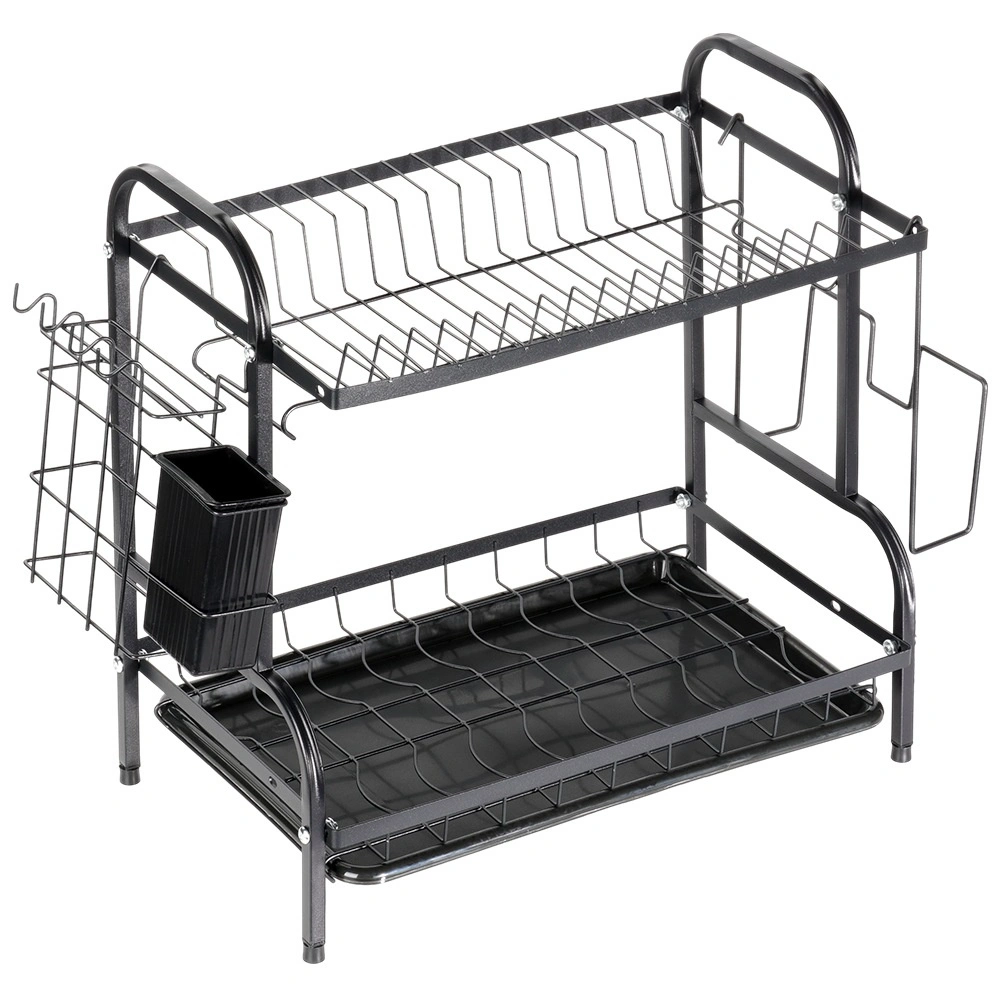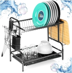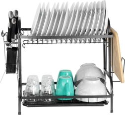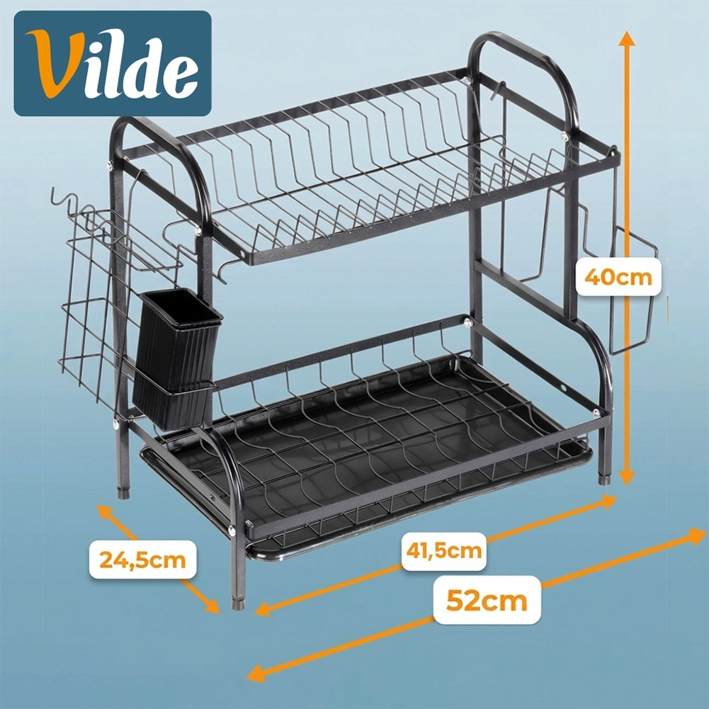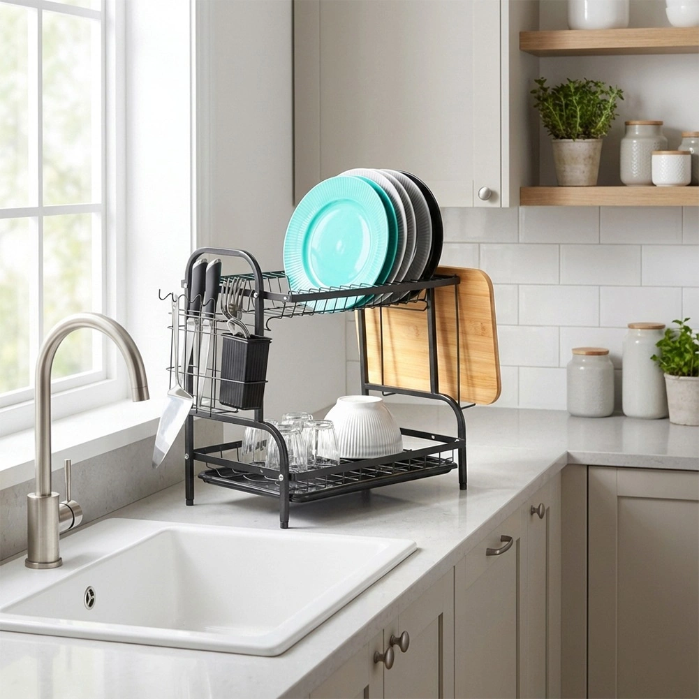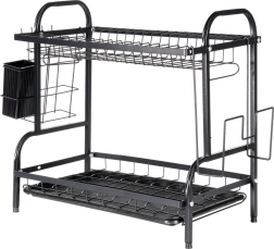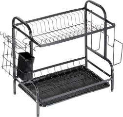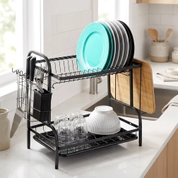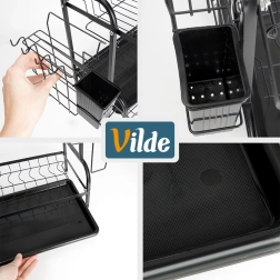 Wytrzymała metalowa konstrukcja w matowej czerni jest odporna i łatwa w pielęgnacji. Dolna taca ociekowa z plastiku zbiera wodę i chroni blat kuchenny przed plamami. Całe rozwiązanie idealnie sprawdzi się w mniejszych kuchniach i domach, które chcą mieć naczynia zawsze przejrzyście zorganizowane.