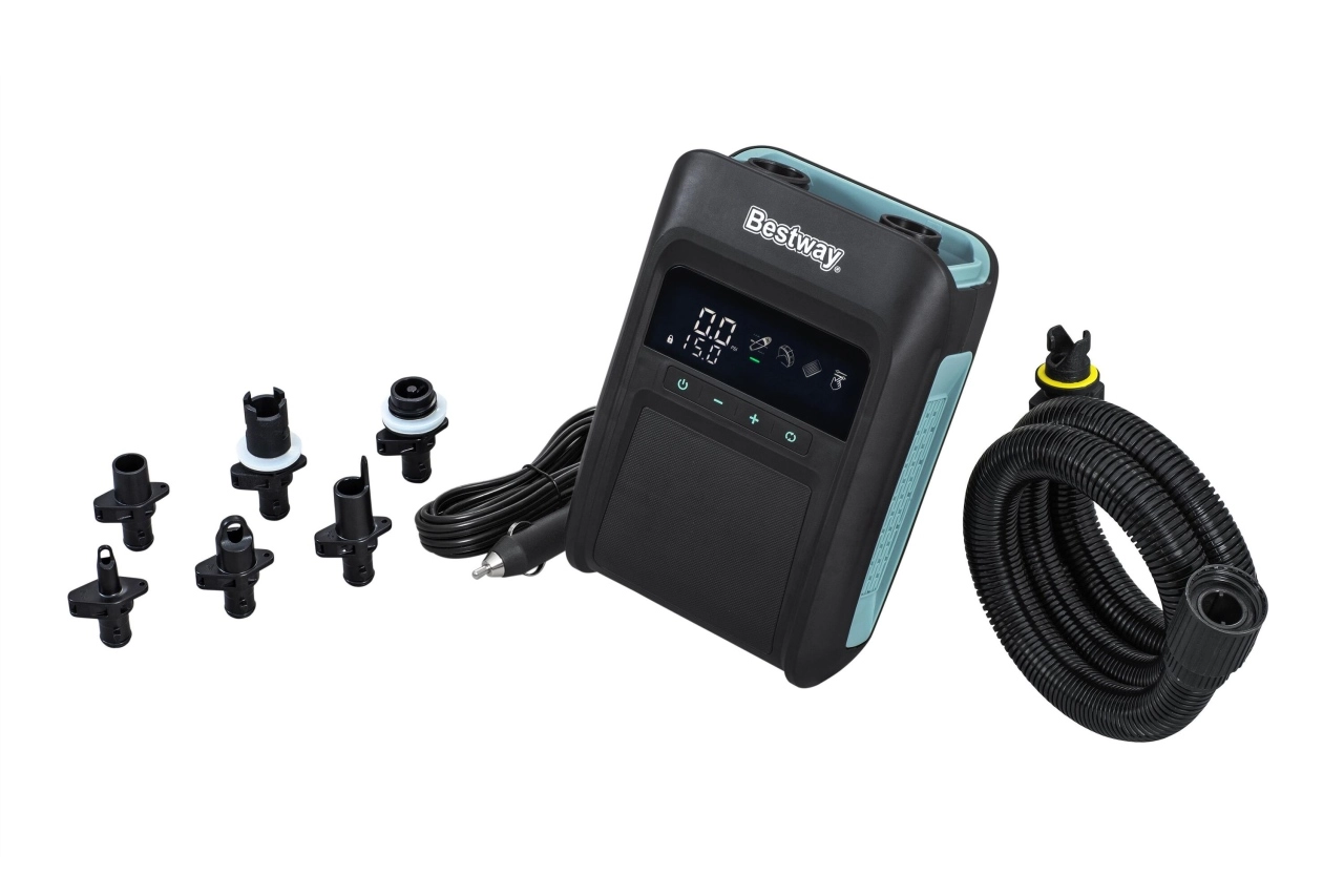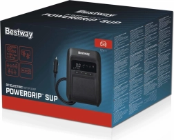 Wydajna elektryczna pompka BESTWAY PowerGrip na 12 V z cyfrowym wyświetlaczem, automatycznym wyłączaniem i maks. ciśnieniem 20 PSI szybko napompuje SUP, łodzie i pontony. Oferuje podwójny silnik, tryby niskiego i wysokiego ciśnienia oraz precyzyjne ustawianie co 0,1 PSI.