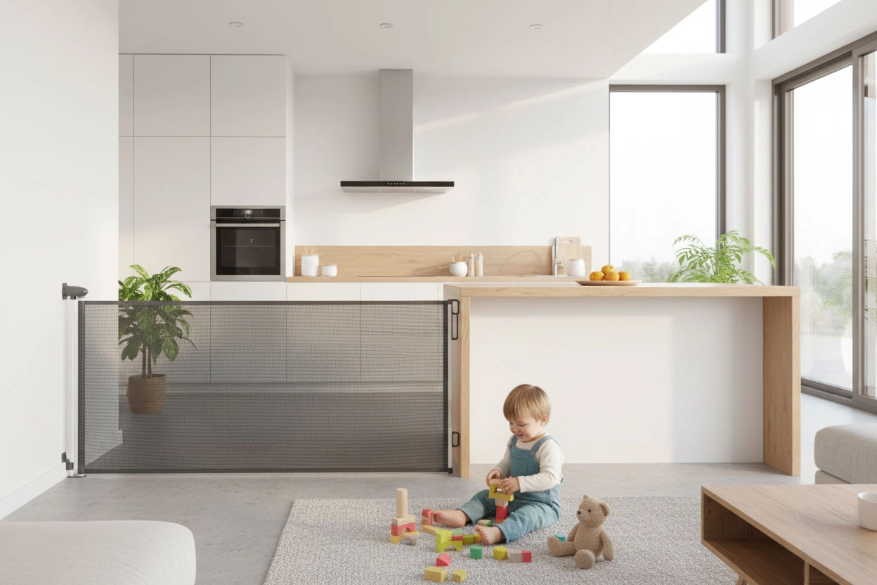 Wysuwana barierka ECOTOYS to niezawodne rozwiązanie do blokowania dostępu do schodów, kuchni lub pomieszczeń technicznych. Gęsto tkana siatka PVC zapewnia dobrą widoczność i przepływ powietrza, a zarazem tworzy solidną barierę fizyczną dla małych dzieci i zwierząt.