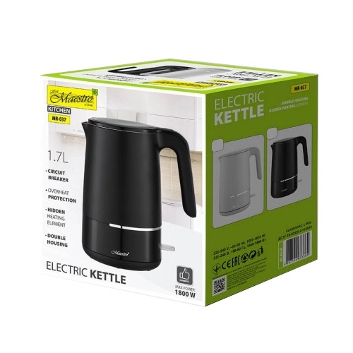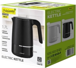 Stylowy elektryczny czajnik Maestro o pojemności 1,7 l i mocy 1800 W oferuje szybkie podgrzewanie wody, bezpieczną podwójną ściankę chroniącą przed oparzeniem oraz trwałe wnętrze ze stali nierdzewnej 304. Praktyczna obrotowa podstawa 360° zapewnia wygodne użytkowanie w każdej kuchni.