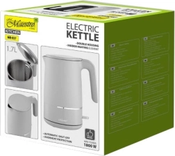 Stylowy czajnik elektryczny MAESTRO o pojemności 1,7 l i mocy 1800 W zapewnia szybkie podgrzewanie wody, bezpieczne użytkowanie dzięki podwójnej ściance oraz higieniczne wykonanie z stali nierdzewnej 304. Praktyczna obrotowa podstawa 360° i eleganckie szare wykończenie doskonale pasują do każdej kuchni.