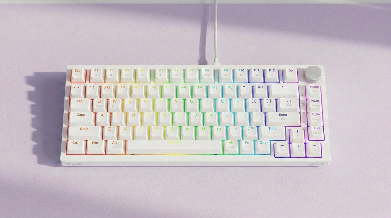ASTRAL White podnosi komfort pisania i grania dzięki bezkontaktowym magnetycznym przełącznikom OUTEMU White Jade z czujnikiem Halla. Oferują szybszą reakcję, gładki liniowy skok oraz wyjątkową trwałość do 100 000 000 naciśnięć. Kompaktowy układ z 82 klawiszami oszczędza miejsce na biurku i daje więcej przestrzeni dla myszy, nie rezygnując z kluczowych funkcji.