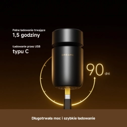 Ergonomiczna metalowa konstrukcja z wykończeniem odpornym na mikrocząstki gwarantuje pewny chwyt nawet w mokrych dłoniach. Długi czas pracy do 90 minut i szybkie, 90‑minutowe ładowanie czynią z niej niezawodnego towarzysza w domu i w podróży.
