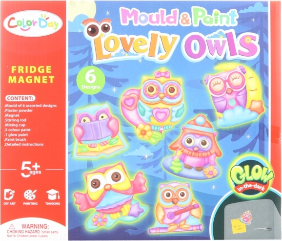 Kreatywny zestaw do wyrobu świecących w ciemności magnesów-sówek. 6 motywów, farby, gips, pędzelek i magnesy w zestawie. Zabawa dla dzieci od 5 lat.