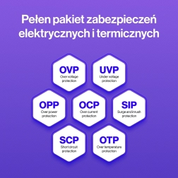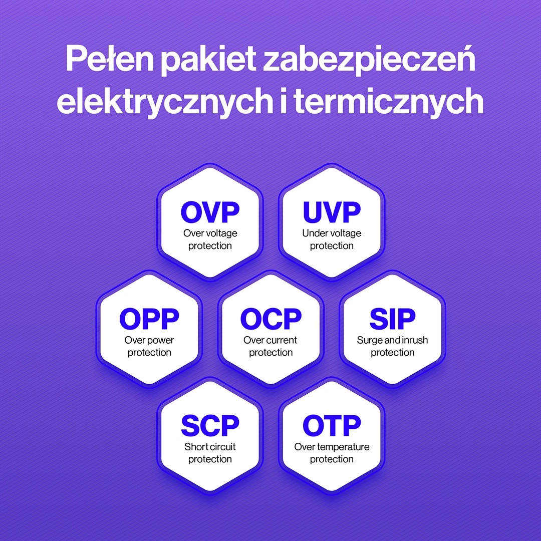 - Pakiet zabezpieczeń elektrycznych i termicznych (OVP/UVP/OCP/OPP/SCP/OTP)