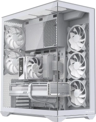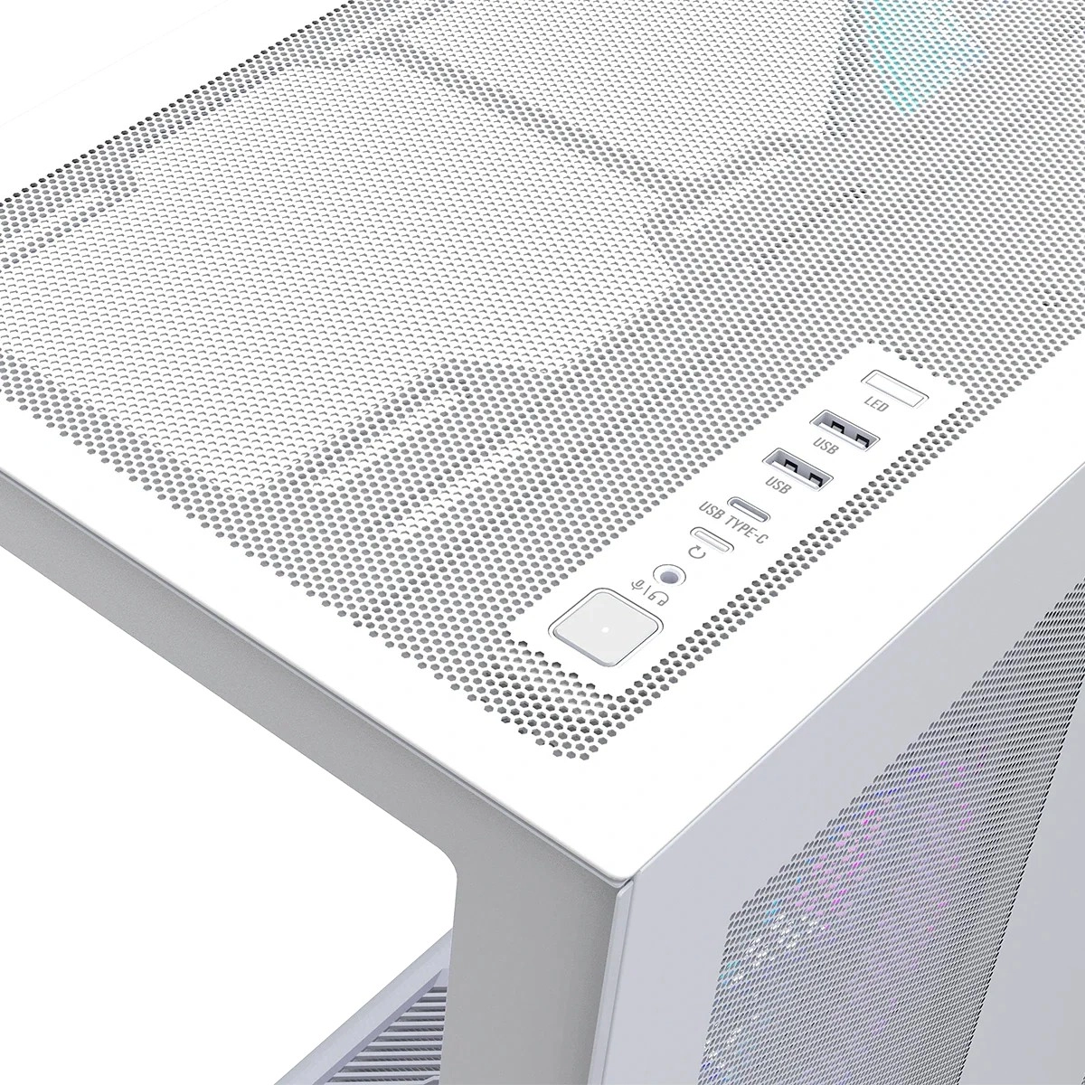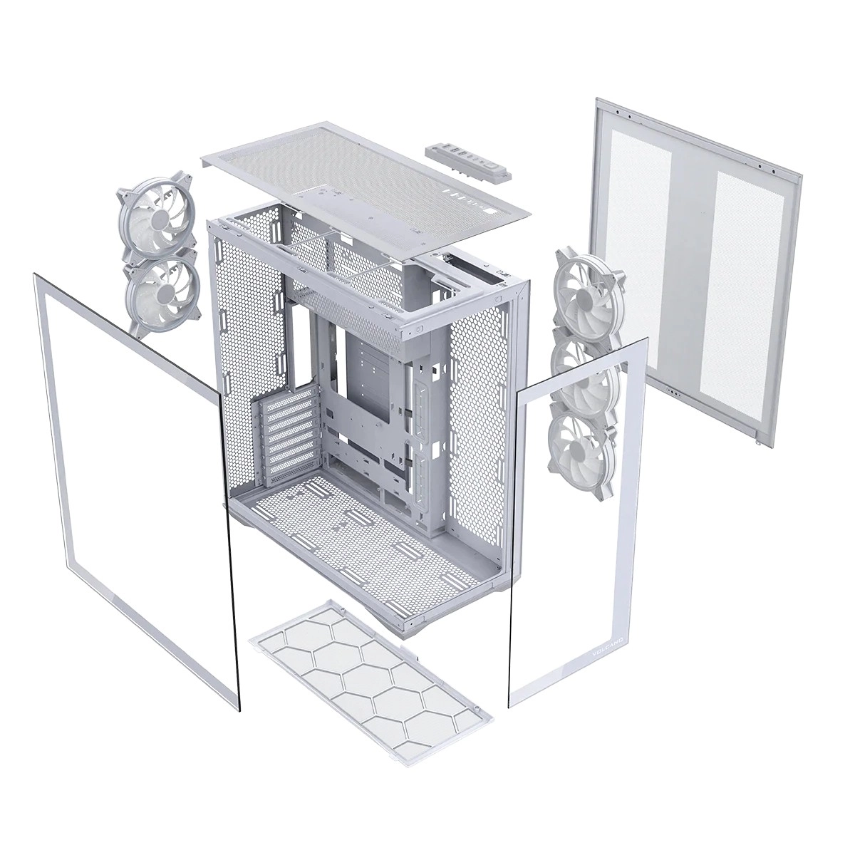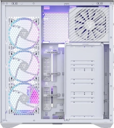 Obudowa została zaprojektowana z myślą o optymalnym przepływie powietrza: w standardzie otrzymujesz 5× 140 mm ARGB (3× na bocznym panelu w układzie reversed, 2× z tyłu). Dodatkowe miejsca montażowe znajdują się na górze, dole i przy komorze zasilacza. Panele na szybkozłączkach przyspieszają dostęp do podzespołów, a wsparcie dla płyt z odwróconymi złączami ułatwia zarządzanie okablowaniem i zapewnia czysty wygląd bez widocznych przewodów.