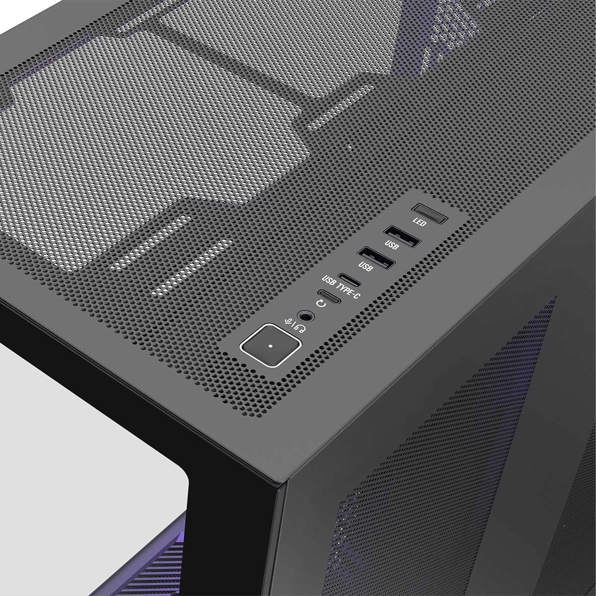 Przedni i boczny panel z hartowanego szkła zamieniają zestaw w atrakcyjną ekspozycję i podkreślają podświetlenie ARGB oraz czyste prowadzenie kabli.