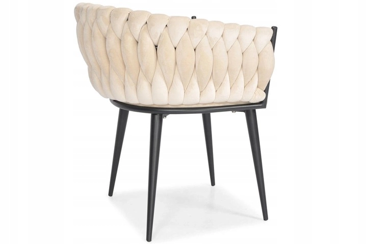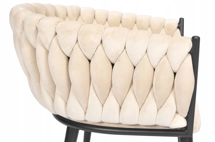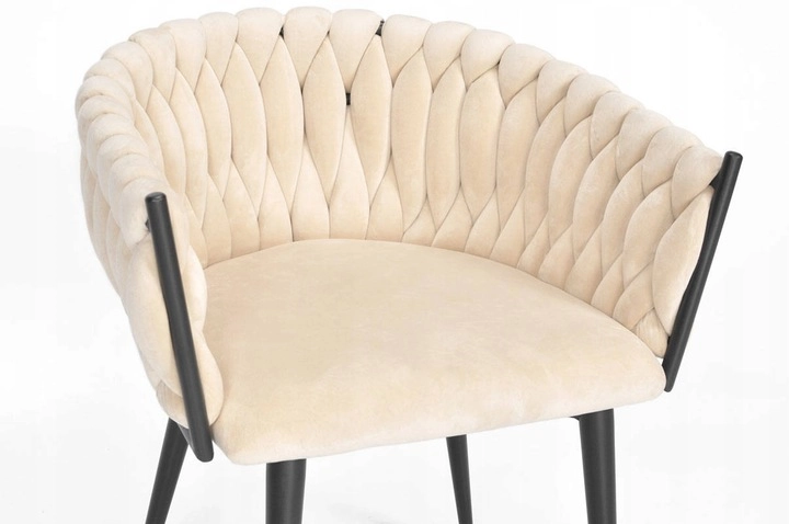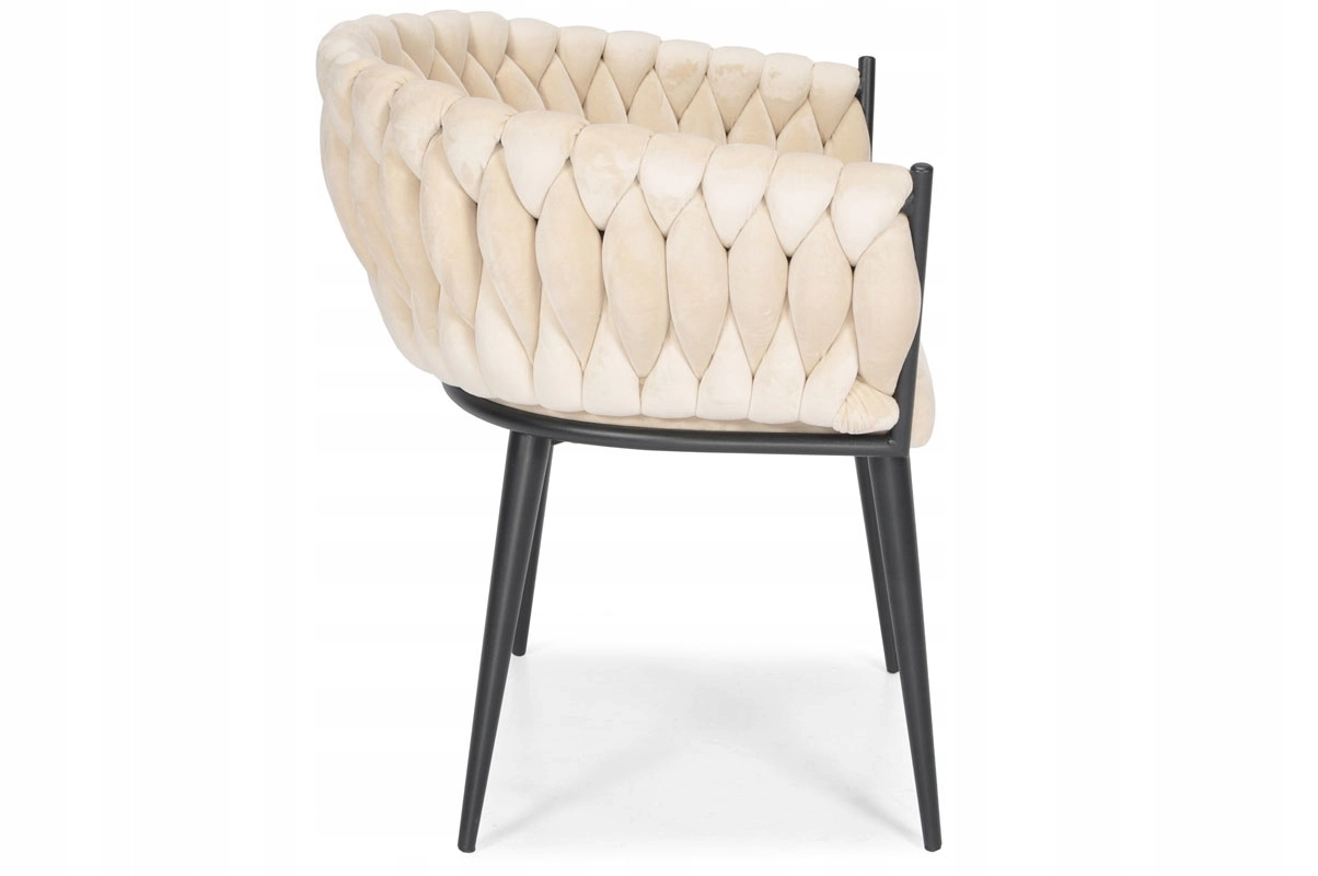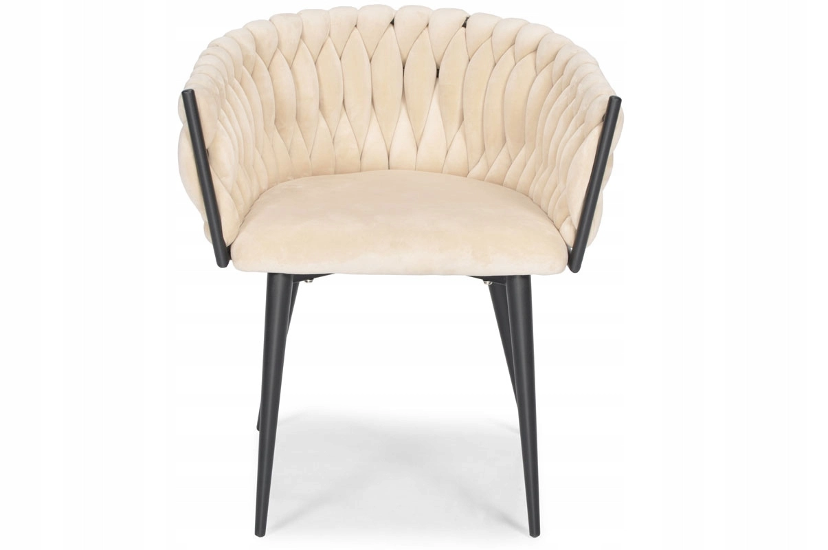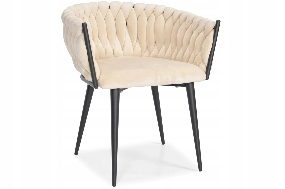 Elegancki aksamitny fotel w beżowym kolorze łączy luksusowy wygląd, nowoczesną plecioną tapicerkę oraz stabilne czarne metalowe nogi. Kokonowy kształt z podłokietnikami zapewnia wysoki komfort przy stole jadalnianym i w salonie, a dzięki plecionemu oparciu 3D nadaje wnętrzu wyrazisty efekt „wow”.